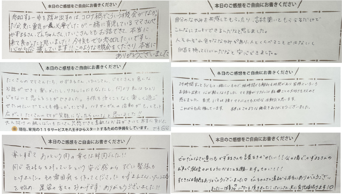 2023/08/07 11:29私自身、まだまだ手のかかる息子2人の母。正社員で保育士の仕事をして充実しながらもバタバタの毎日。シングルマザーだった経験もあり、子育て支援には元々興味があった中でのかずまるさんとの出会いでした。母親支援とゆうのは、世代が少し違うと理解してもらいにくかったり社会からも問題視されにくい問題です。「好きで子供を産んだんでしょ」「自分の子供は自分で育てないと」とゆうような言葉を何回も浴びながら私も子育てをしてきました。悩むポイントや、タイミング、心のキャパは人それぞれ。私はどんなママたちも頑張っていると思うし、助けてあげたい。そんな思いでかずまるさんの活動に参加させてもらってきました。119で出逢う人たちは、かずまるさん、景子さんをはじめ、みんな本当に温かくて愛があります。人と人の繋がりって、心の温かさがすごく大切だと思います。実際にこの温かいイベントに参加するみなさんは初対面なのに、涙を流して心の底の悩みを打ち明けてくれています。119を利用して少しでも心が軽くなり、また頑張ろう!と思ってもらえるような活動をこれからも続けていきたいと思います!運営保育士より もっと見る