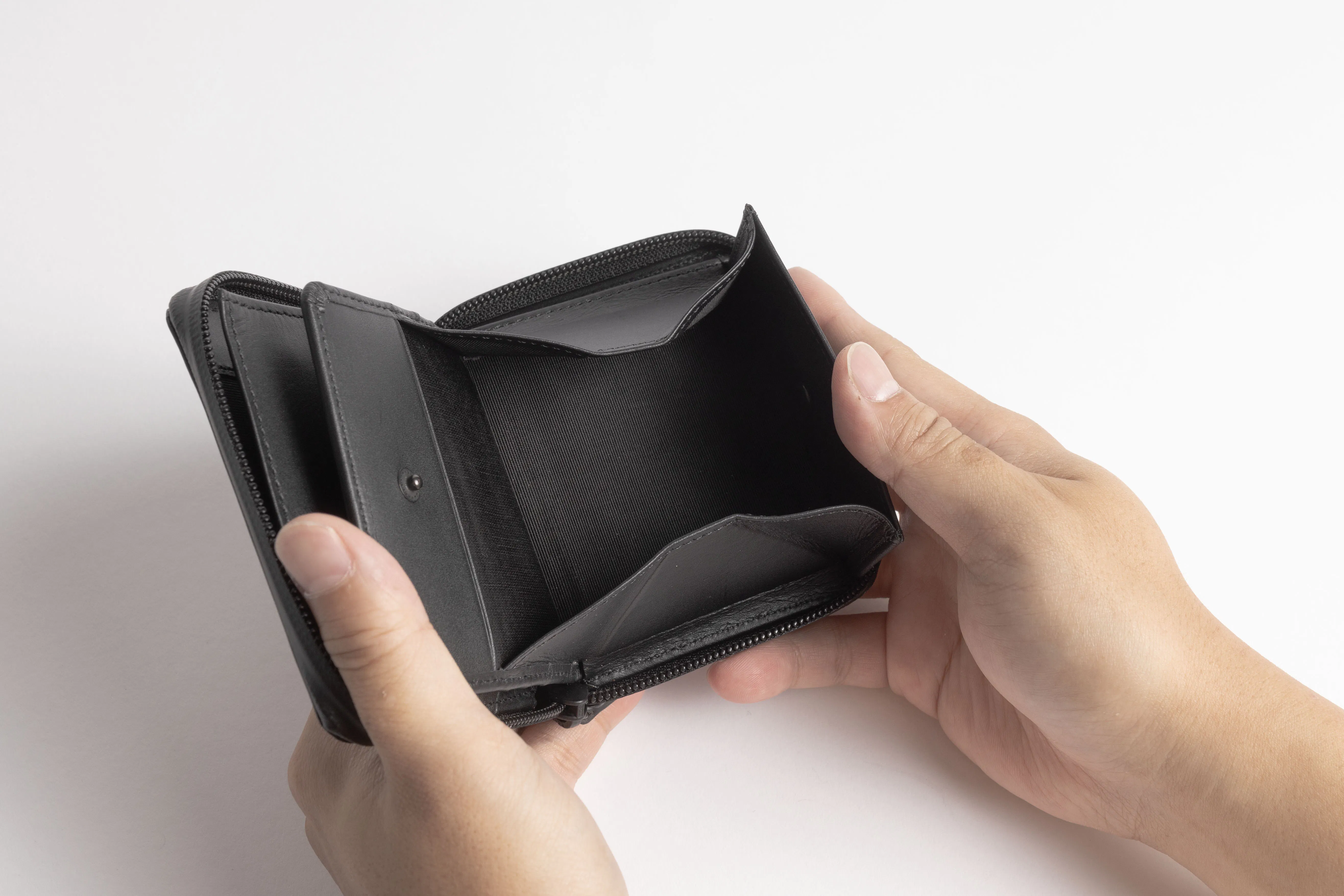 コインポケットにはほどよい深さを設け、小銭がこぼれにくく仕上げました。内部を見渡せるので、目当ての硬貨へのアクセスが簡単。おつりを受け取った際も、流し込むようにして収納できます。