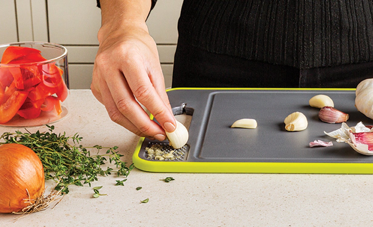 まな板の端にはなんとおろし金が!にんにくやしょうが、ハーブなどちょっとした食材をおろすのにぴったりです。わざわざおろし金を出す必要がないので、洗い物の手間が減るのも嬉しいポイント!