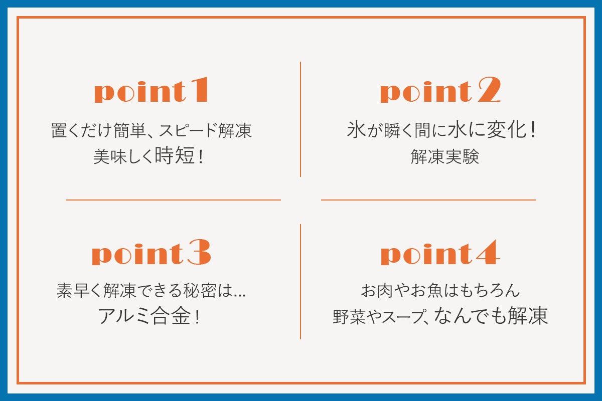 昨今、食品を冷凍する機会が非常に増えました。「冷凍するための商品」は沢山販売される中、冷凍した食品を「解凍するための商品」はまだまだ少ないと思います。しかし、解凍には時間がかかったり、美味しさが失われてしまったり様々な悩みがあるはずです。