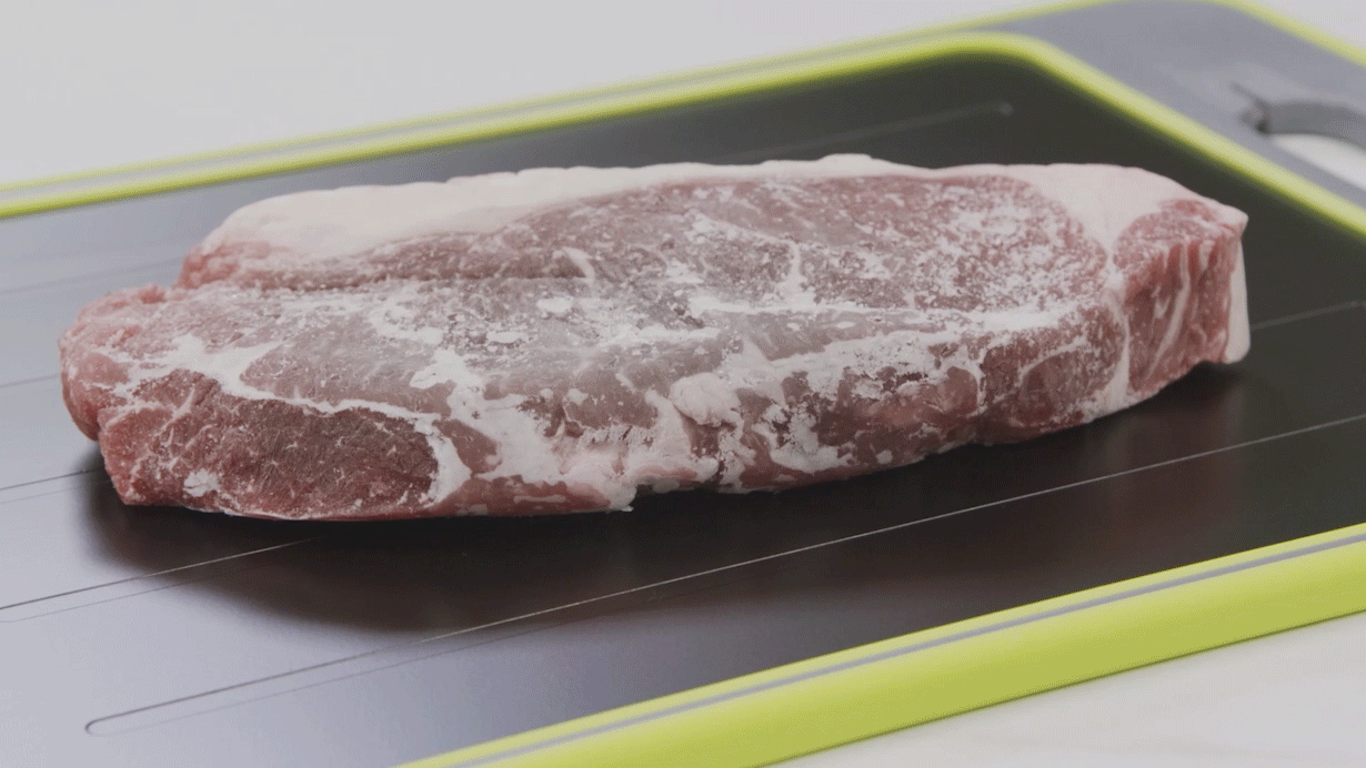 まな板に解凍したい食材を乗せるだけ!熱伝導効率がいいので、なんと通常時の約2倍※のスピードで自然に解凍することができます。ガスや電気を使わないので場所を選ばずにご使用いただけます。あくまで自然解凍なので、熱を使い急速に解凍することで旨味が逃げてしまうこともなく、よりおいしくまるで冷凍前のように解凍することができます。