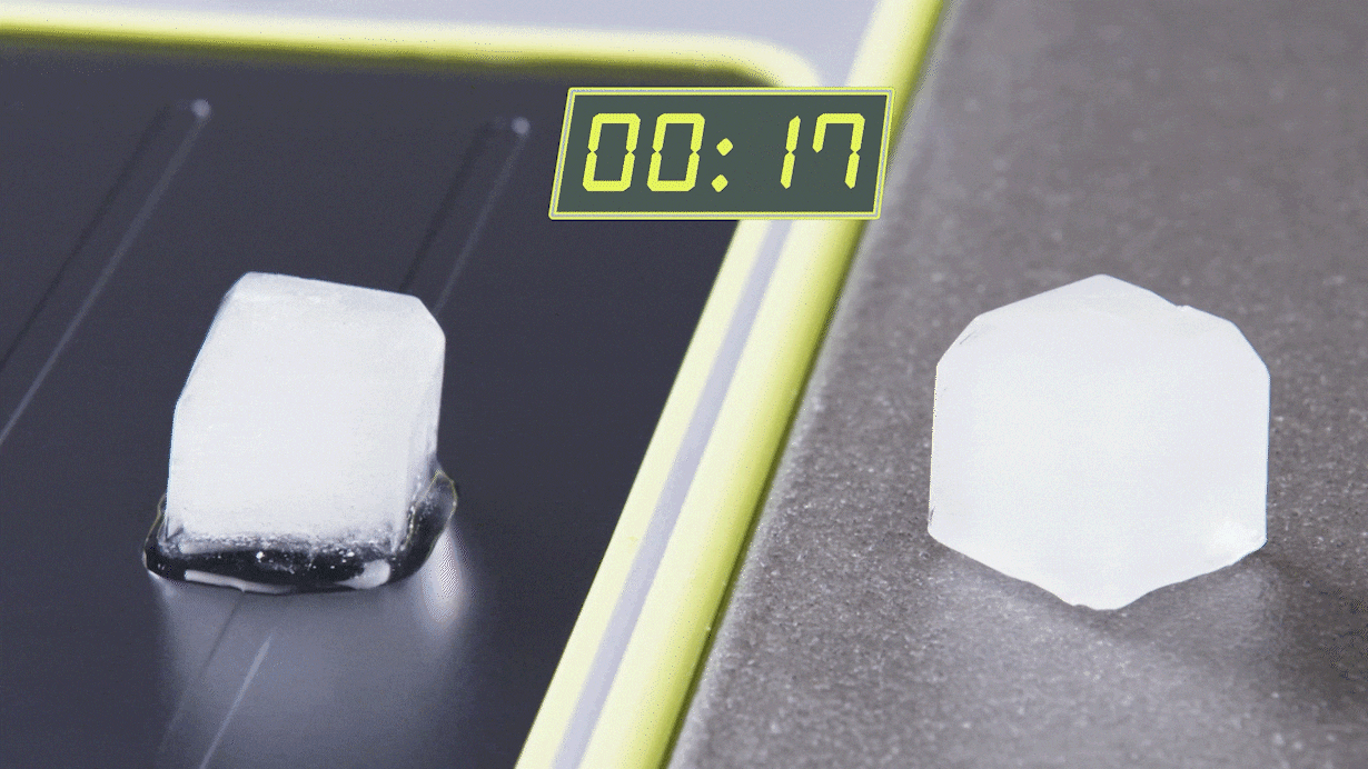 まな板の解凍プレート部分と、そうじゃない部分に氷を置くとその差は一目瞭然! 解凍プレートに置いた氷はたった5分でほとんどが水となりましたが、解凍プレートじゃない部分の氷は全く溶けていません。