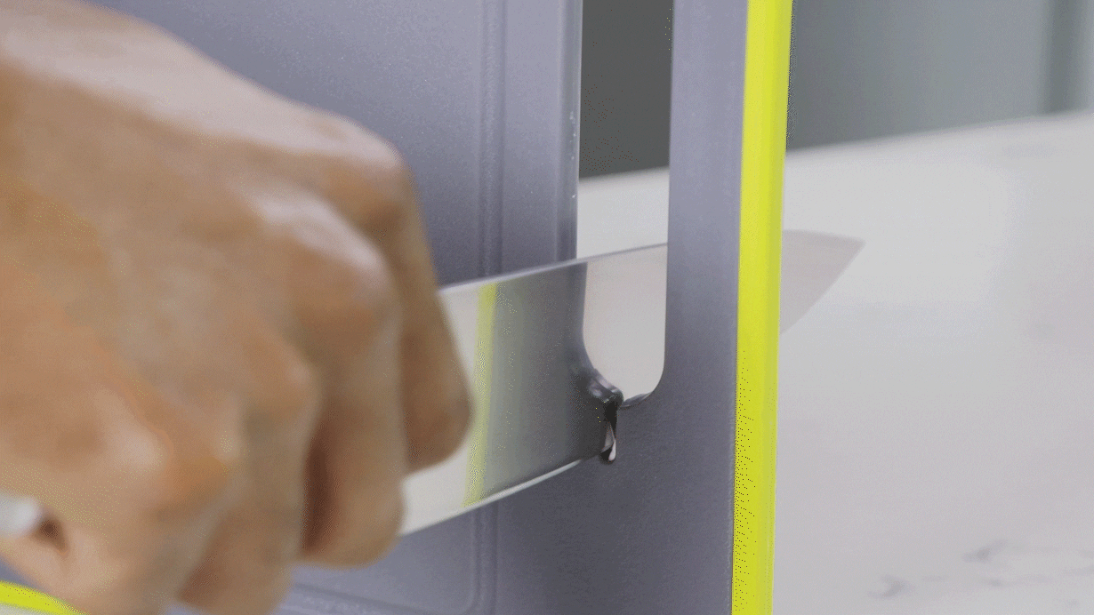 「なんだか包丁が切りにくい...」そう感じたときは、まな板を立てて持ち手部分のくぼみに滑らせるだけ!あっという間に包丁研ぎが完了します。