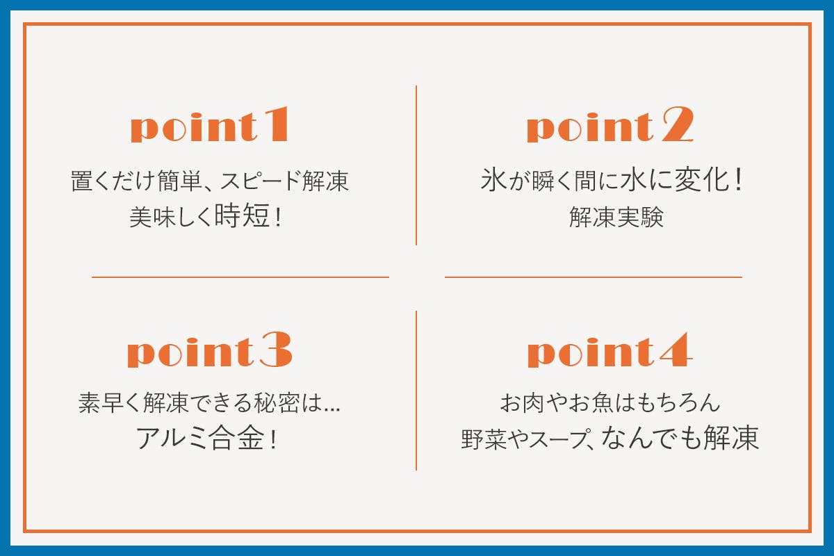 昨今、食品を冷凍する機会が非常に増えました。「冷凍するための商品」は沢山販売される中、冷凍した食品を「解凍するための商品」はまだまだ少ないと思います。しかし、解凍には時間がかかったり、美味しさが失われてしまったり様々な悩みがあるはずです。