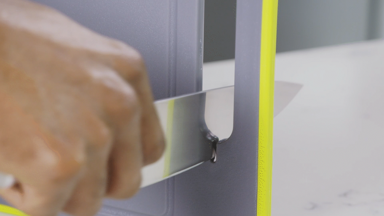 「なんだか包丁が切りにくい...」そう感じたときは、まな板を立てて持ち手部分のくぼみに滑らせるだけ!あっという間に包丁研ぎが完了します。