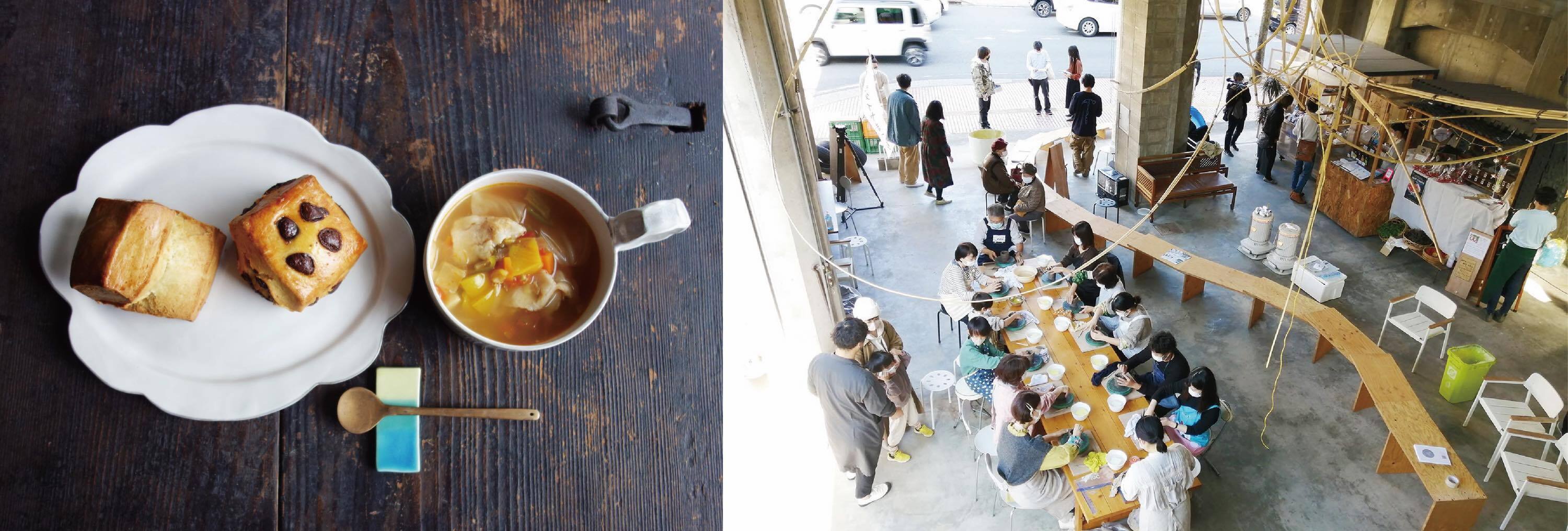 左:カフェラウンジで販売する予定のスコーンとスープ