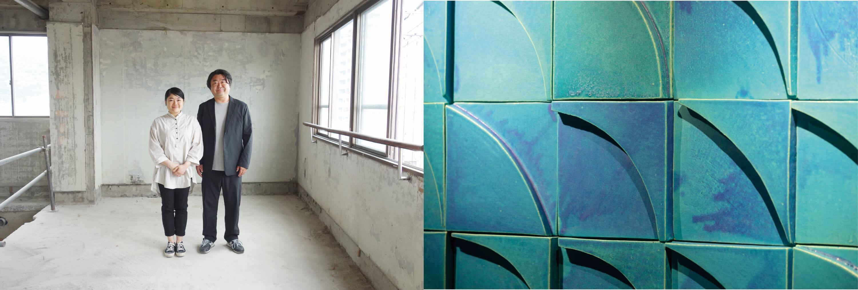 右:宿主人(妻)である陶芸家 坂本和歌子による陶板アート「凪」