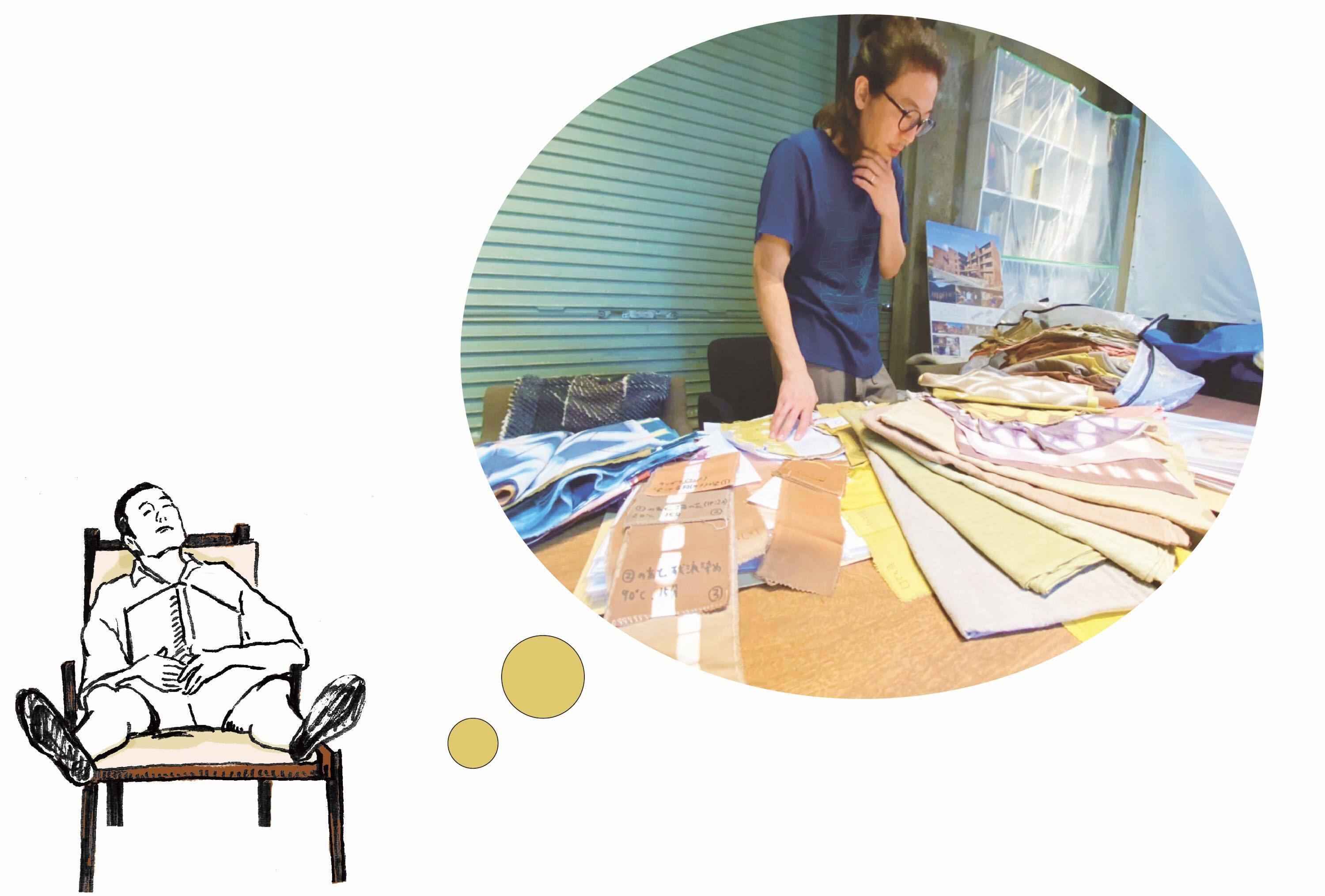 イスの座面張り替えに使う温泉染めした生地を打ち合わせ中。