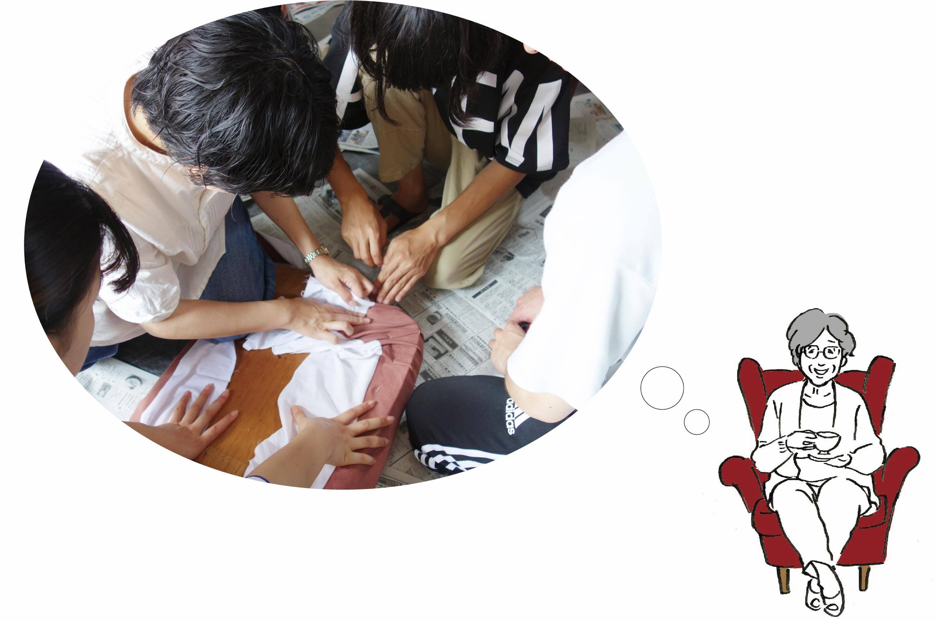 温泉染の生地で実際に張り替えの試作をしている様子●思い出のお引き継ぎ