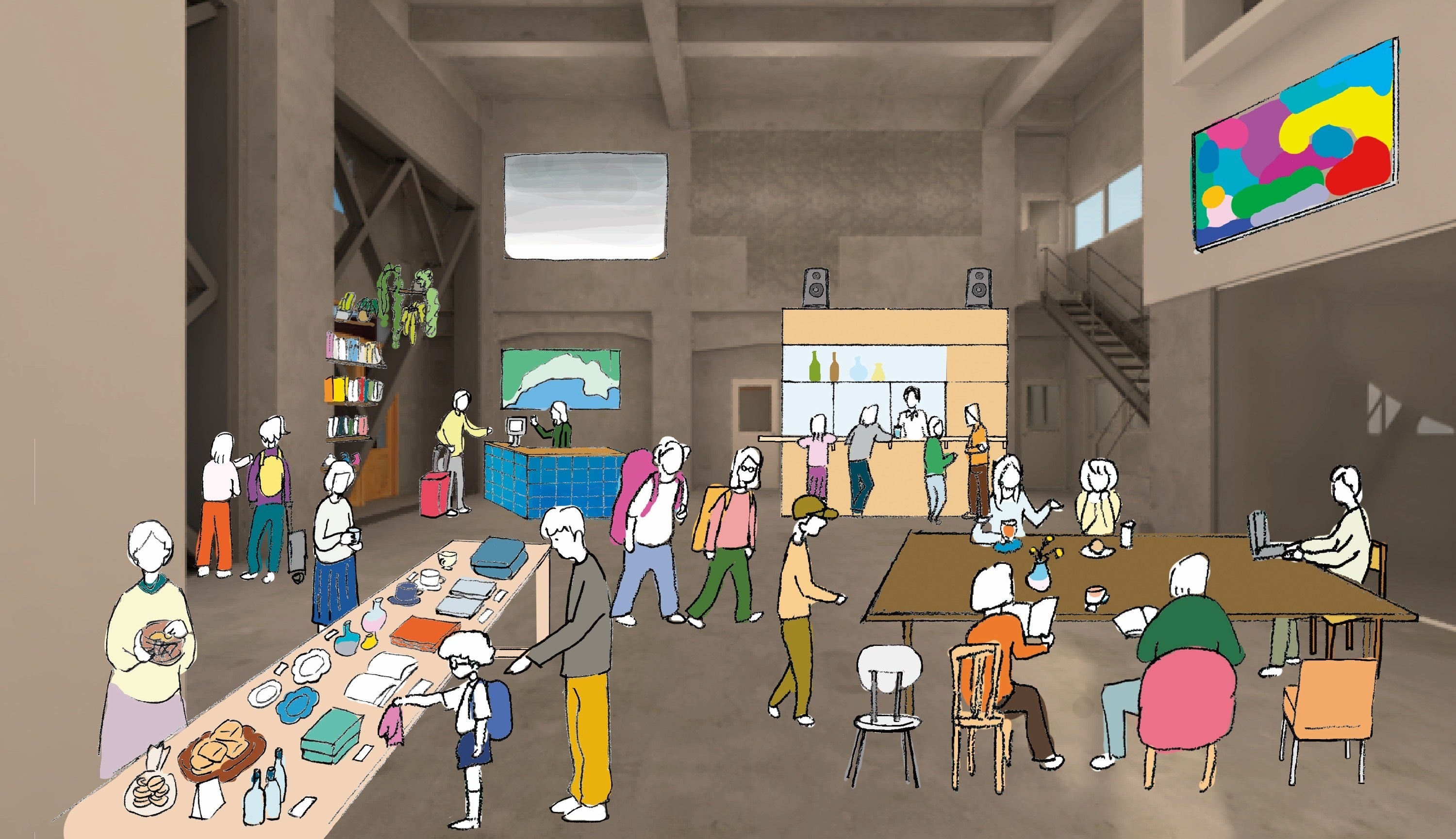 1階にはカフェラウンジを設けます。地域の生産者による食材を用いたフードやドリンクを提供し、地域の人も気軽に立ち寄れる空間とします。館内パブリックスペースはギャラリーやイベントスペースとしても活用でき、ゲストと地域の人々の交流機会を継続的につくります。
