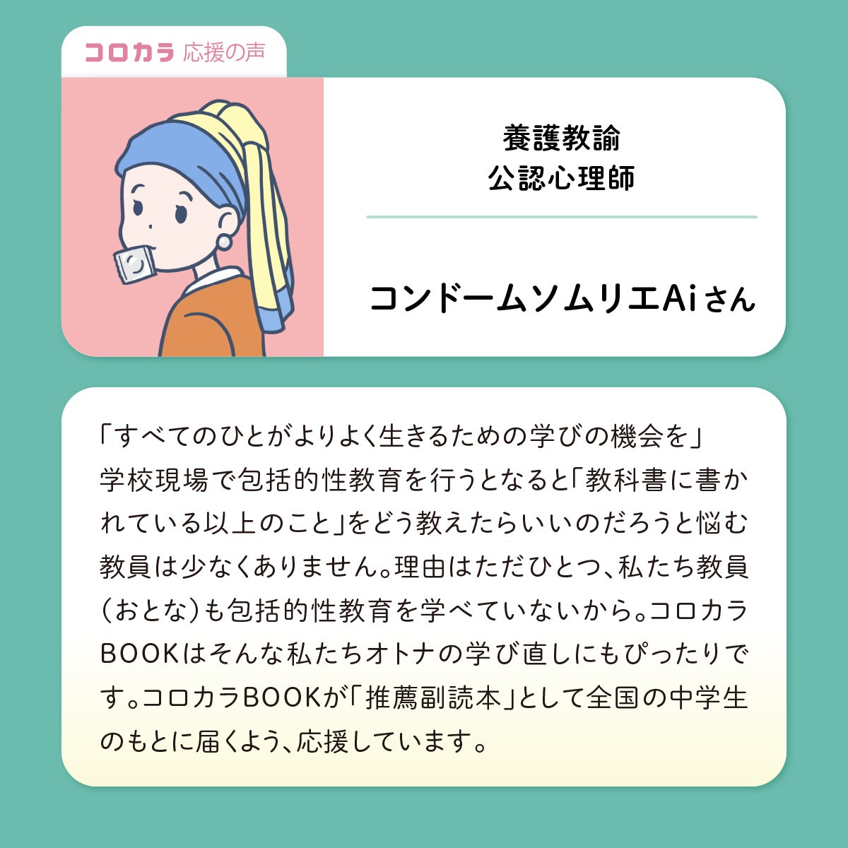 学校現場で包括的性教育を行うとなると「教科書に書かれている以上のこと」をどう教えたらいいのだろうと悩む教員は少なくありません。理由はただひとつ、私たち教員(おとな)も包括的性教育を学べていないから。コロカラBOOKはそんな私たちオトナの学び直しにもぴったりです。コロカラBOOKが「推薦副読本」として全国の中学生のもとに届くよう、応援しています。