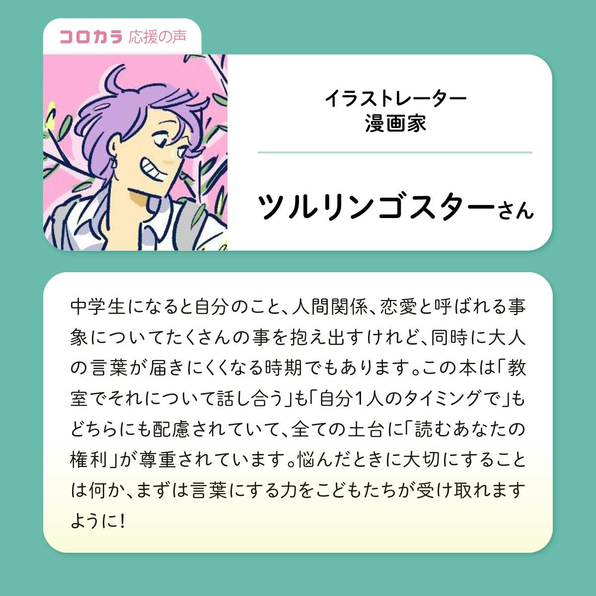ツルリンゴスターさんには、クラファン開始早々にご支援&拡散いただいたことを知り、喜びのあまり思わずお声がけをさせていただきました。応援メッセージもご快諾いただき、ありがとうございます!性教育に関わる内容を漫画という形に落とし込み、日々発信されている方からこのように応援していただけること、とても心強く思います!
