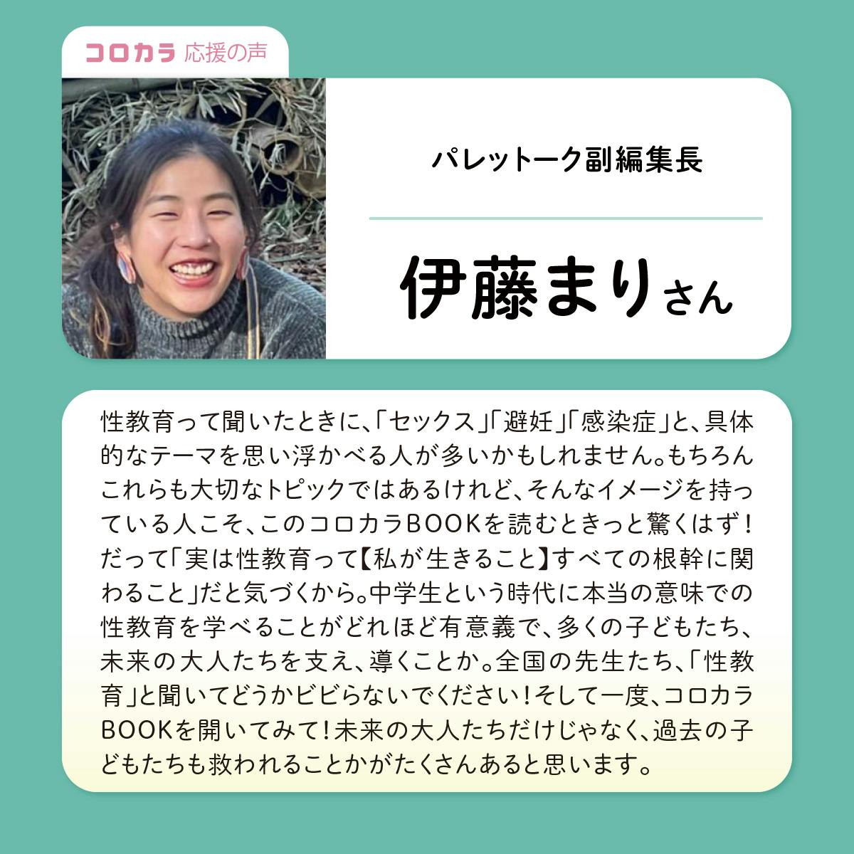 性教育って聞いたときに、「セックス」「避妊」「感染症」と、具体的なテーマを思い浮かべる人が多いかもしれません。もちろんこれらも大切なトピックではあるけれど、そんなイメージを持っている人こそ、このコロカラBOOKを読むときっと驚くはず!だって「実は性教育って【私が生きること】すべての根幹に関わること」だと気づくから。中学生という時代に本当の意味での性教育を学べることがどれほど有意義で、多くの子どもたち、未来の大人たちを支え、導くことか。全国の先生たち、「性教育」と聞いてどうかビビらないでください!そして一度、コロカラBOOKを開いてみて!未来の大人たちだけじゃなく、過去の子どもたちも救われることかがたくさんあると思います。