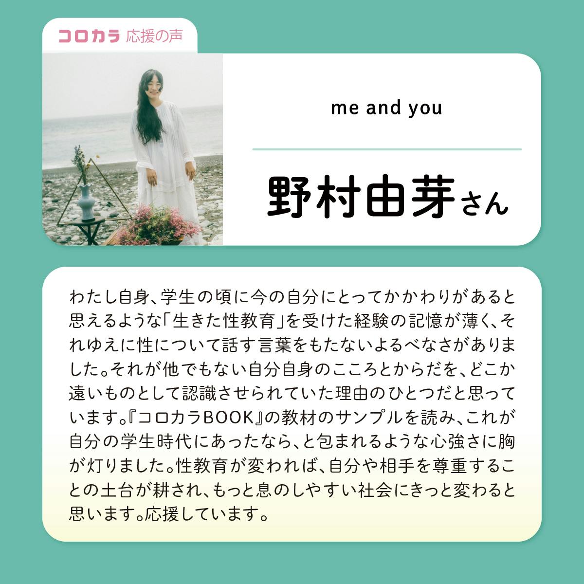 わたし自身、学生の頃に今の自分にとってかかわりがあると思えるような「生きた性教育」を受けた経験の記憶が薄く、それゆえに性について話す言葉をもたないよるべなさがありました。それが他でもない自分自身のこころとからだを、どこか遠いものとして認識させられていた理由のひとつだと思っています。『コロカラBOOK』の教材のサンプルを読み、これが自分の学生時代にあったなら、と包まれるような心強さに胸が灯りました。性教育が変われば、自分や相手を尊重することの土台が耕され、もっと息のしやすい社会にきっと変わると思います。応援しています。
