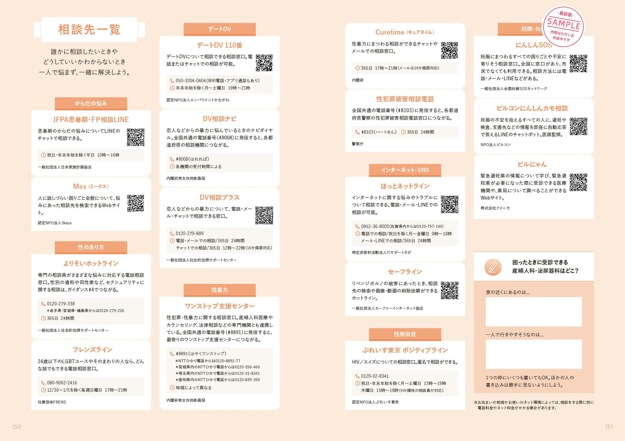 巻末には、いろいろな相談先を一覧にしてまとめたページをご用意しました!誰かに相談したいときやどうしていいかわからないとき、このページのことを思い出してもらえたら、と思います。悩みや困りごとの内容によっては、自分自身で解決することが難しい場合もあります。そんなとき、子どもたちが一人で悩まず、適切な相談先にアクセスできることを願っています。