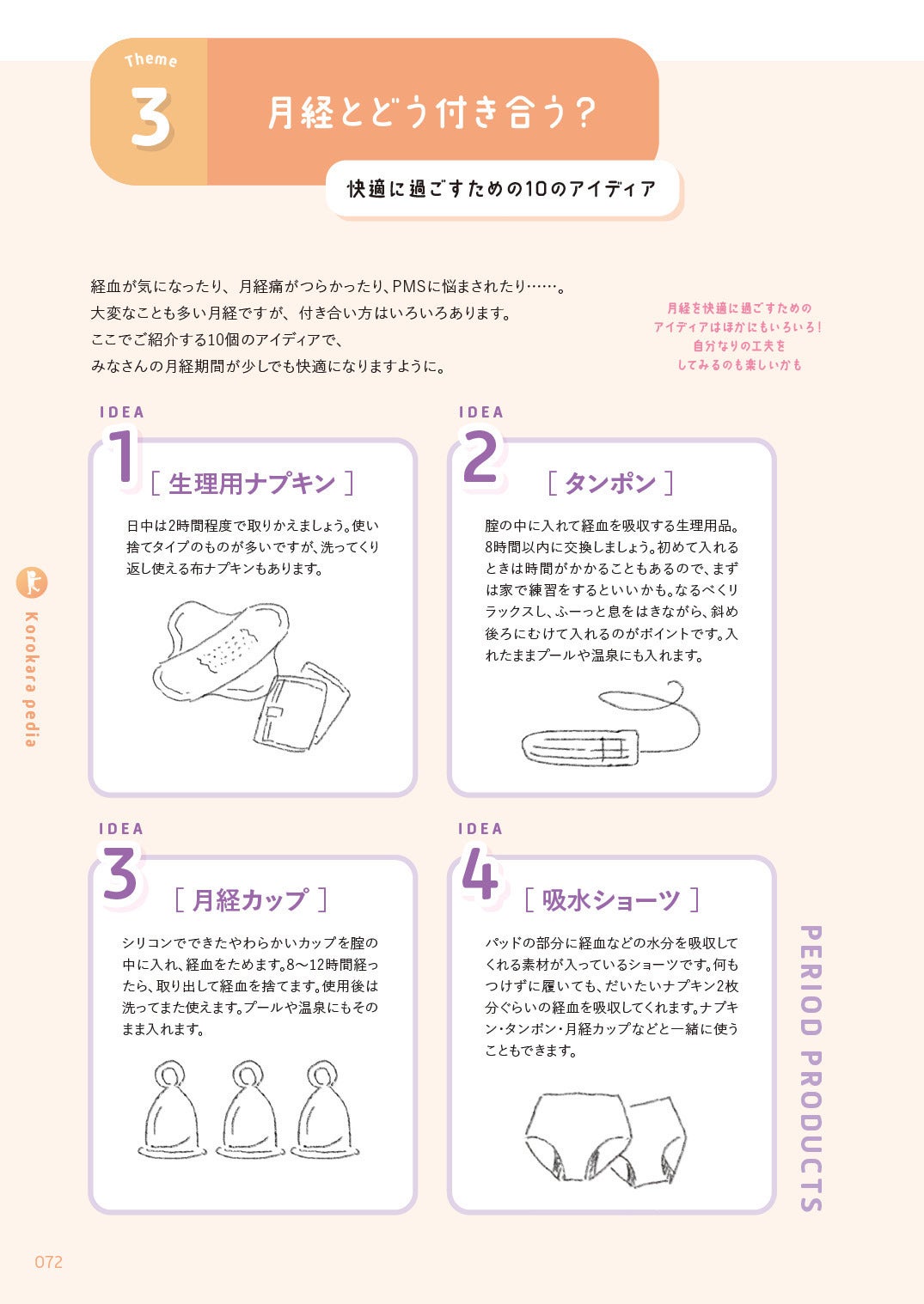 月経の悩みは人によって様々です。自分にしっくりくる月経との付き合い方を見つけるために、色々な選択肢があることを知っていてほしい。そんな思いで、月経期間を少しでも快適に過ごすための10の方法をまとめました。(残りの6つでは「痛み止めの薬」や「低用量ピル」なども紹介しています)