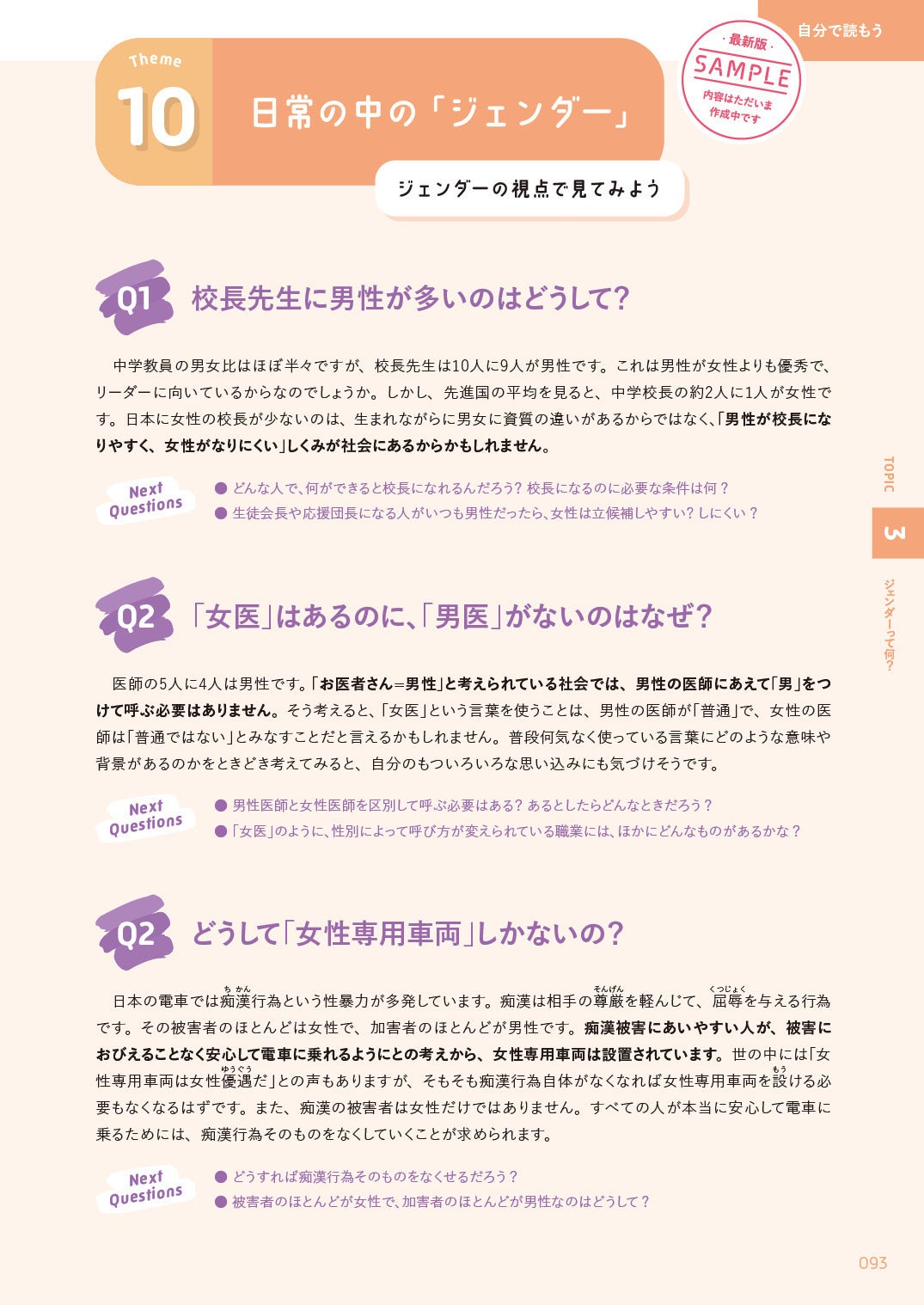 「校長先生にはなぜ男性が多いんだろう?」「『女医』とは言うけど、『男医』と言わないのはなぜ?」このページでは、ジェンダーにまつわる身近な疑問を取り上げて解説しています。ジェンダーの視点で日常を眺めてみることは、何となく抱えていたモヤモヤの原因に気づいたり、自身の何気ない言動を省みたりするきっかけになることと思います。