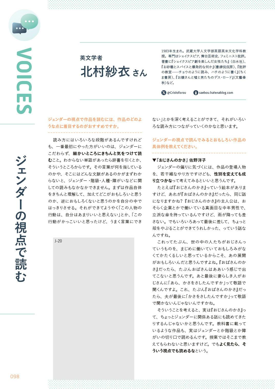 『コロカラBOOK』のVOICESでは、その分野で活躍されている方々へのインタビュー&対談記事を読むことができます。今日は、英文学者の北村紗衣さんへのインタビューの一部を公開します!中学生に身近な題材を例に挙げながら、作品をジェンダーの視点から読み解くことの意義や面白さを語ってくださいました。中学生にとって「映画や文学ってこんなふうに楽しめるんだ!」という気づきになったり、身の回りのものごとをジェンダーの視点から観察するきっかけになったりするとうれしいです。