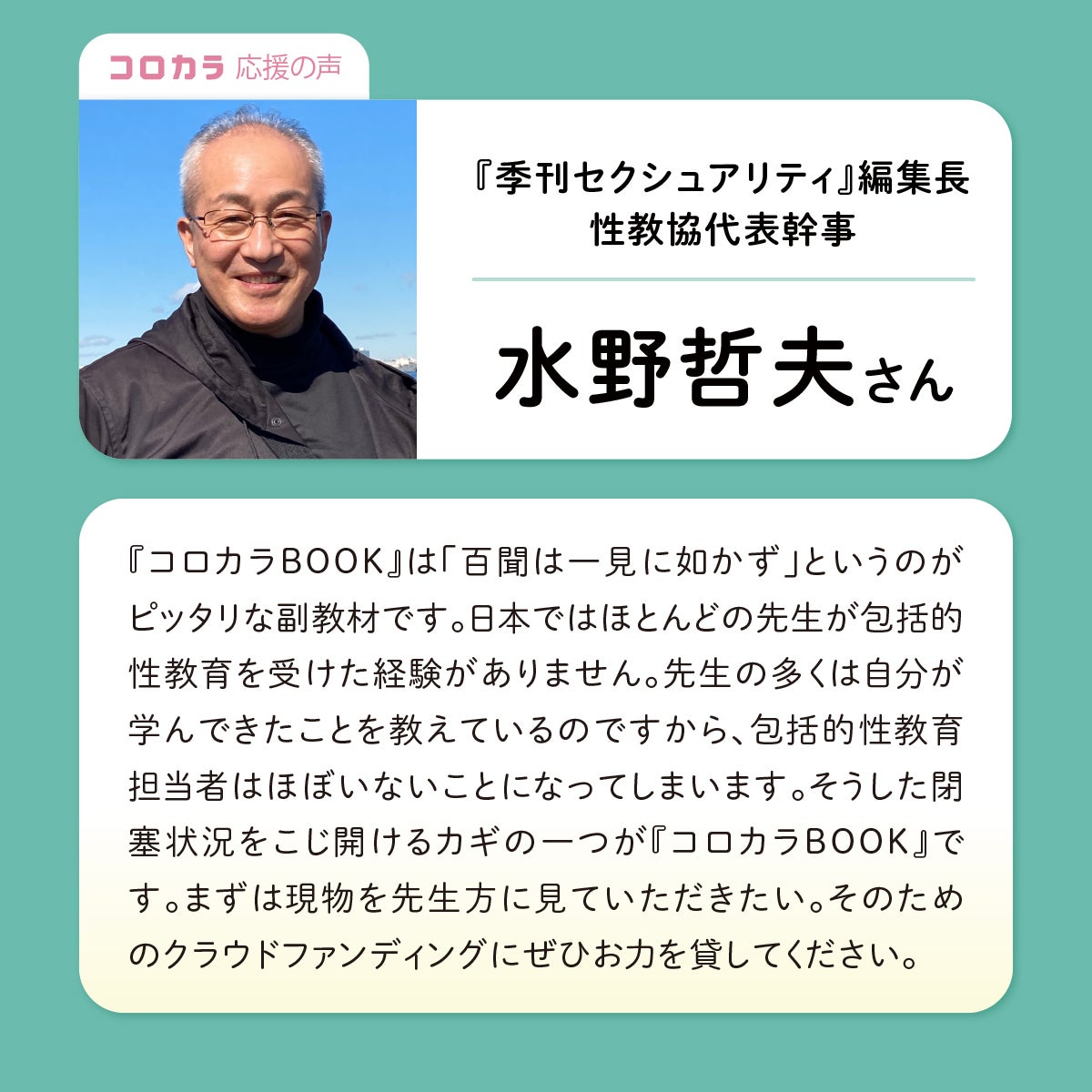「コロカラBOOK」は「百聞は一見に如かず」というのがピッタリな副教材です。日本ではほとんどの先生が包括的性教育を受けた経験がありません。先生の多くは自分が学んできたことを教えているのですから、包括的性教育担当者はほぼいないことになってしまいます。そうした閉塞状況をこじ開けるカギの一つが「コロカラBOOK」です。まずは現物を先生方に見ていただきたい。そのためのクラウドファンディングにぜひお力を貸してください。