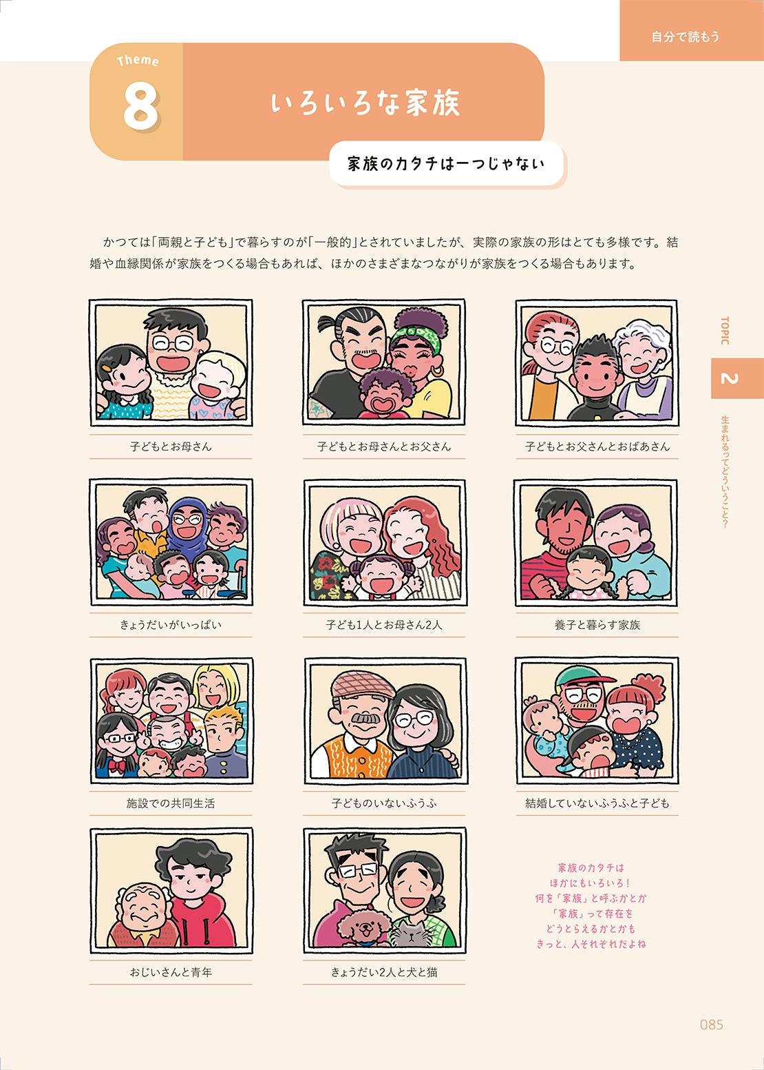 何を「家族」と呼ぶか、また「家族」というものをどうとらえるかは、きっと人それぞれです。家族と暮らす人、そしてそこに幸福を感じる人もいれば、家族をもたず一人で生きることに心地よさを感じる人もいると思います。いろいろな家族のかたちを通して、子どもたちがいろいろな生き方に思いをはせてくれたらうれしいです。
