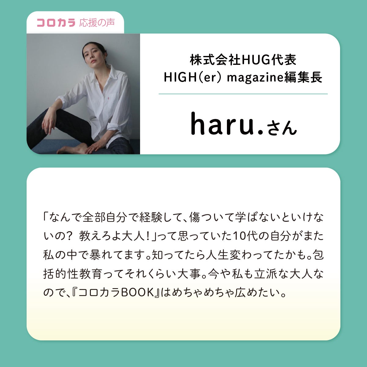 株式会社HUG代表・HIGH(er) magazine編集長のharu.さんより、応援メッセージをいただきました!