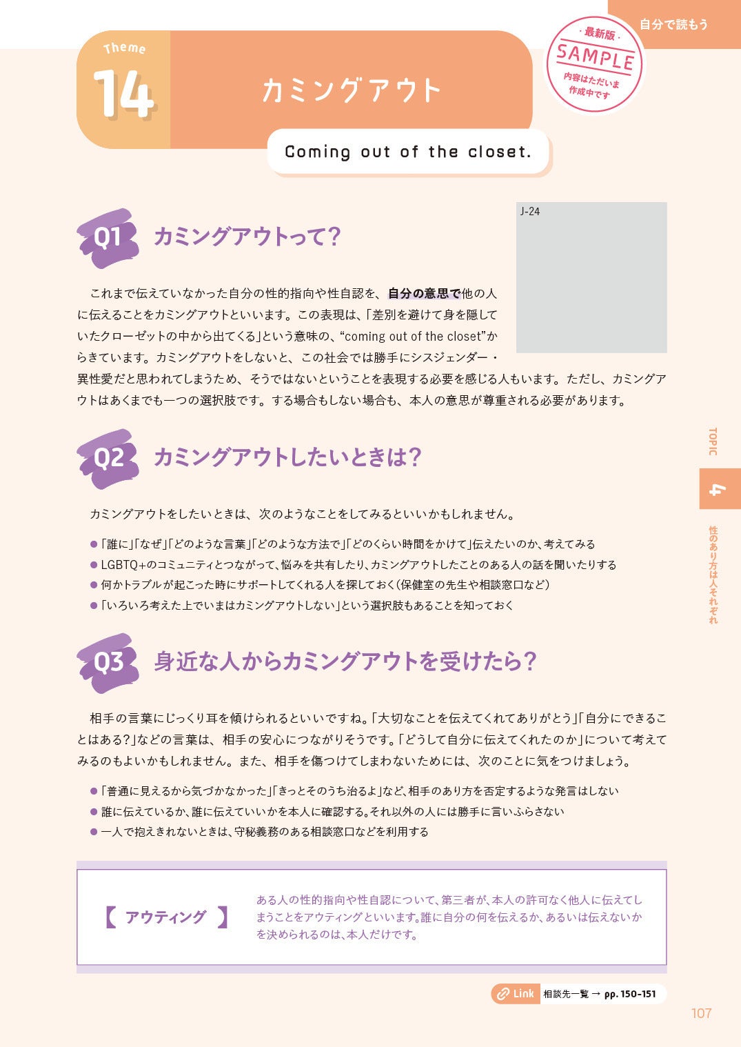 TOPIC 4「性のあり方は人それぞれ」の「自分で読もう」では、カミングアウトについても取り上げています。カミングアウトをしたい人、いまはしたくない人、どうしたらいいか迷っている人……。それぞれの希望や選択を尊重しつつ、とれるかもしれない行動を具体的に記載しました。また、アウティングという言葉も紹介しながら、身近な人からカミングアウトされた際に何ができるかも合わせて説明しています。
