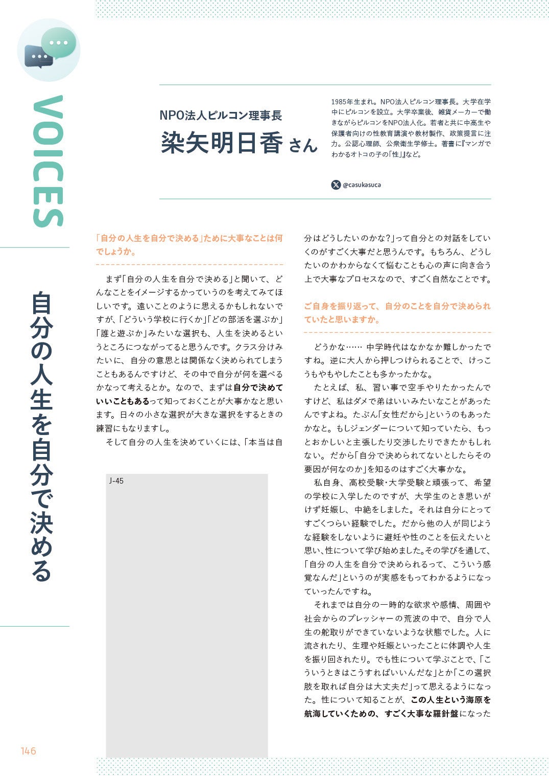 『コロカラBOOK』のVOICESでは、その分野で活躍されている方々へのインタビュー&対談記事を読むことができます。今日は、NPO法人ピルコン理事長の染矢明日香さんへのインタビューの一部を公開します!「自分の人生を自分で決める」というテーマで、ご自身の経験や、性教育と人生の関わりなどについてお話してくださいました。受験や就職、友人関係やパートナーシップなどなど、少しずつ自分で選択することが増えていくであろう中学生が、「自分で決める」ということについて考えたり「自分で決めていいんだ」と思ってくれたりしたらうれしいです。