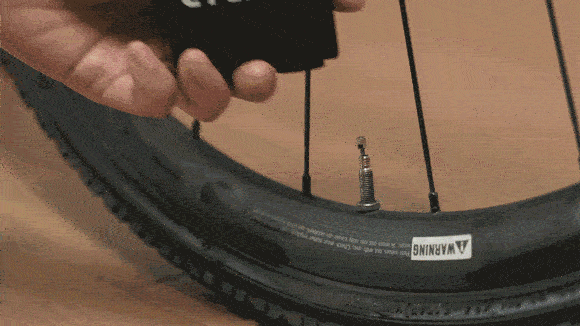 ①「CYCPLUS CUBE」のバルブをタイヤのエアバルブに差し込む。