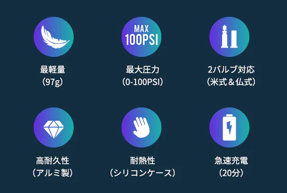 ワンタッチで自動空気充填の簡単操作。ロードバイク用タイヤを0PSIから80PSIまでわずか80秒でスピーディーに空気入れ。20分でフル充電でき、再利用性と携帯性が大幅に向上しています。