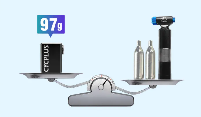 軽量なのに耐久性も併せ持つアルミ合金を採用しており、重量はわずか97g。ワイヤレスイヤホンケースと同程度のコンパクトサイズ、ポケットやバッグなどにすっぽり収納。ライディング中に自転車がパンクした際、パッと取り出してご使用いただけます。