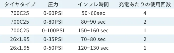 1回の充電でロードバイク用タイヤを0PSIから80PSIまで2本分の空気入れができます。また、待機時の電流は1uA以下と、ほとんど電力を消費しません。