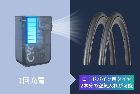 ・コンパクトなのにパワフル!1回の充電でロードバイク用タイヤ2本分の空気入れが可能!