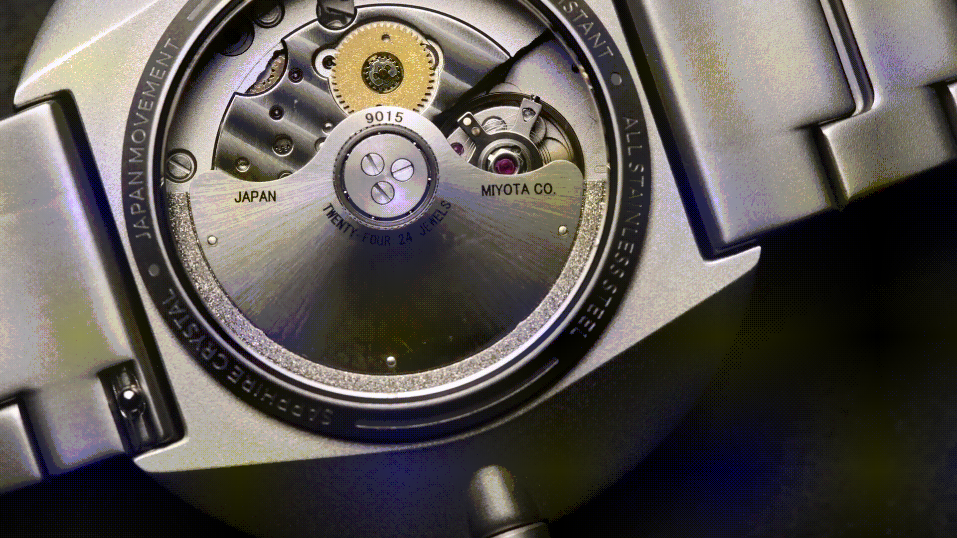 時計の心臓部に当たるムーブメントには、絶対的な安心感がある日本製のミヨタ9015を搭載。自動巻きの時計なので電池交換は不要です。