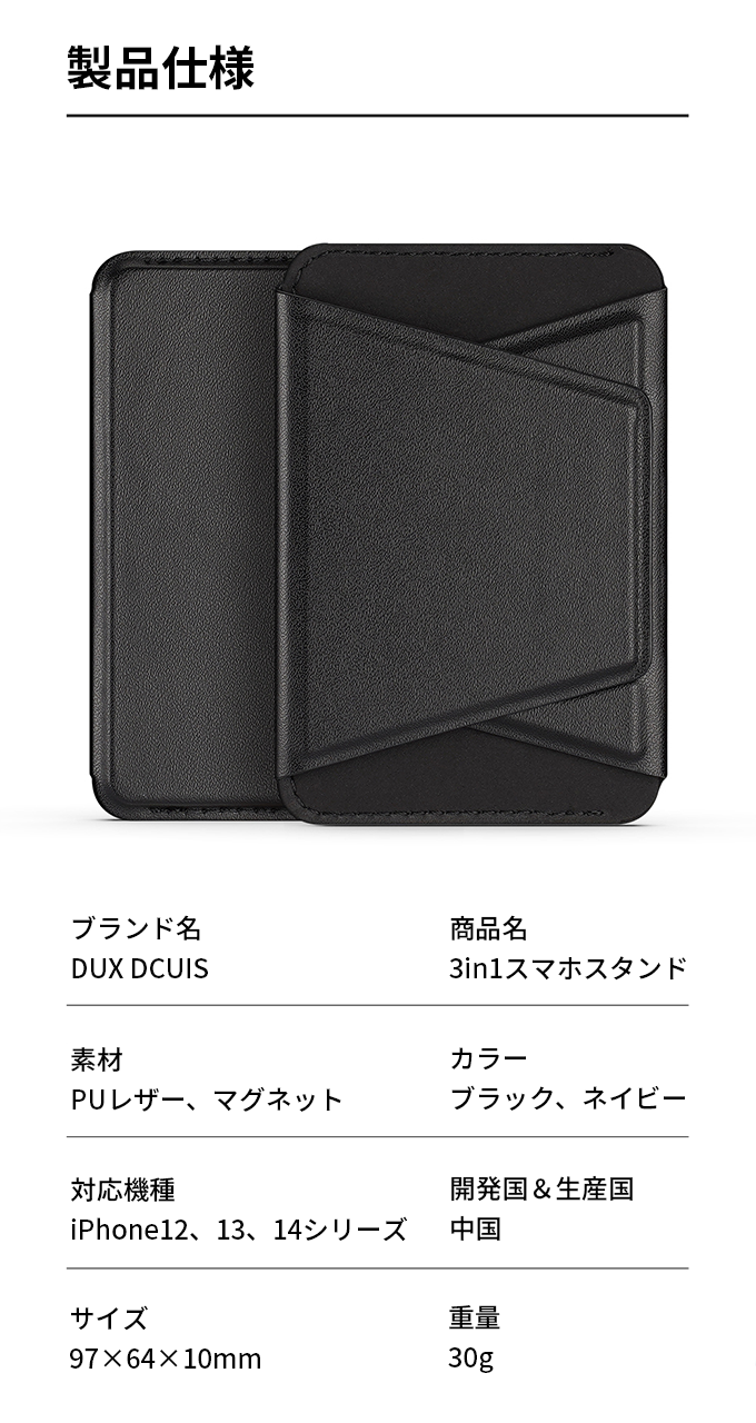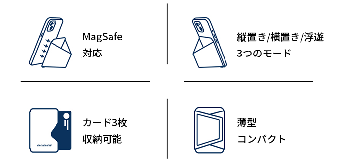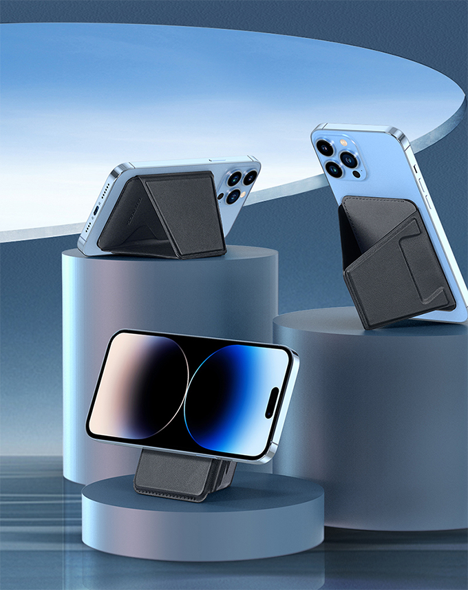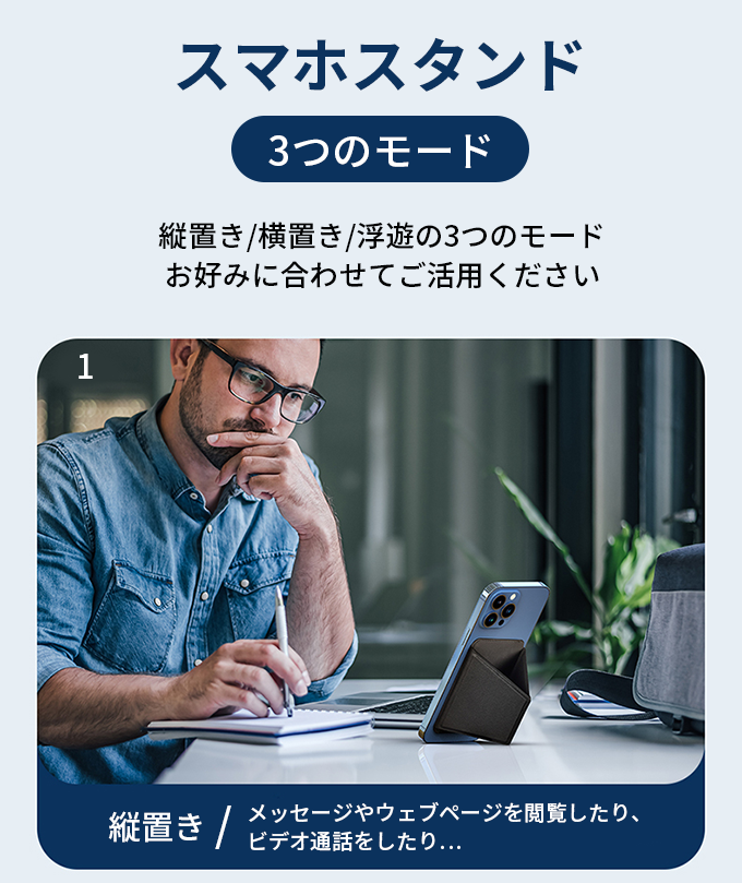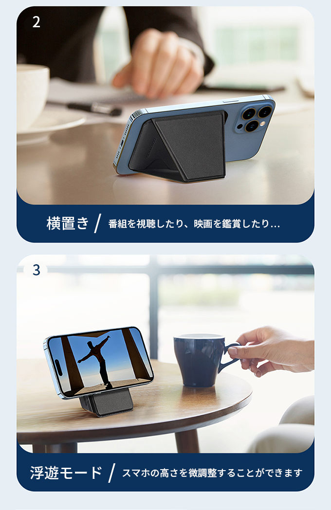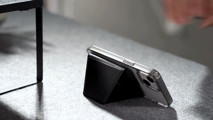 ②MagSafe対応で着脱は自由自在。スマホスタンドとして縦置き&横置きに対応。