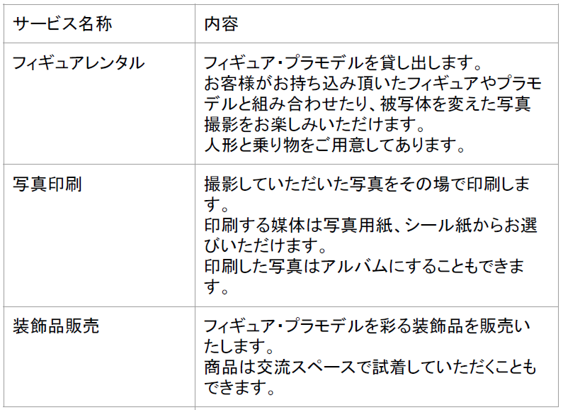 カラオケ程度の感覚でご利用いただけて、6種類の撮影ブース、照明器具、落ち着いて撮れるスペースを用意します。撮影ブースにはジオラマを1点配置します。