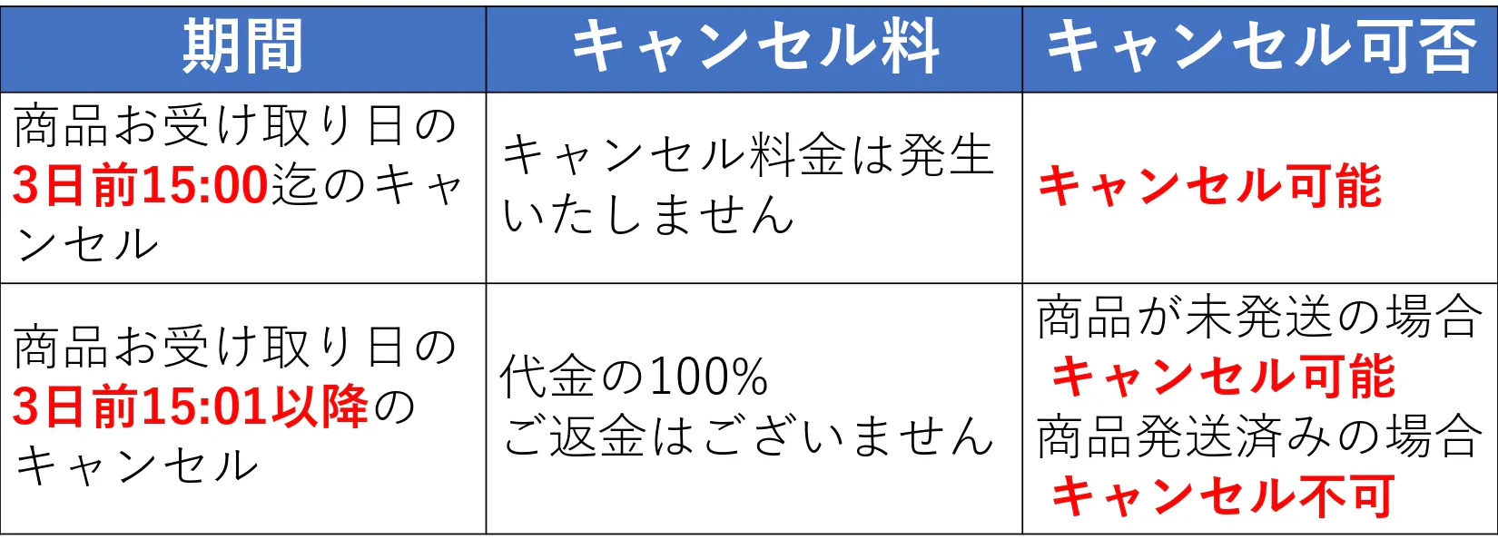 キャンセル料金は以下参照してください。
