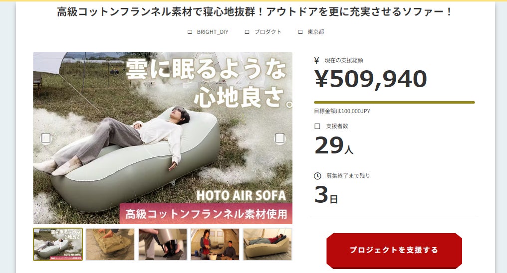 ご支援者様、Brightチームです。お世話になっております。プロジェクト開始から57日目で31人ものご支援者の方々より支援頂き、無事プロジェクト終了を迎えることが出来ました。早速皆様のリターンを2023年10月にお届けできるよう準備を始めております!皆様にご満足いただけるリターンをお届けできるよう、全力で取り組んで参りますので引き続き、「高級コットンフランネル素材で寝心地抜群!アウトドアを更に充実させるソファー!HOTO AIR SOFA 」をよろしくお願い致します。クラウドファンディングの状況をお伝えいたします。皆様の大切なご支援、本当にありがとうございます。Brightチーム