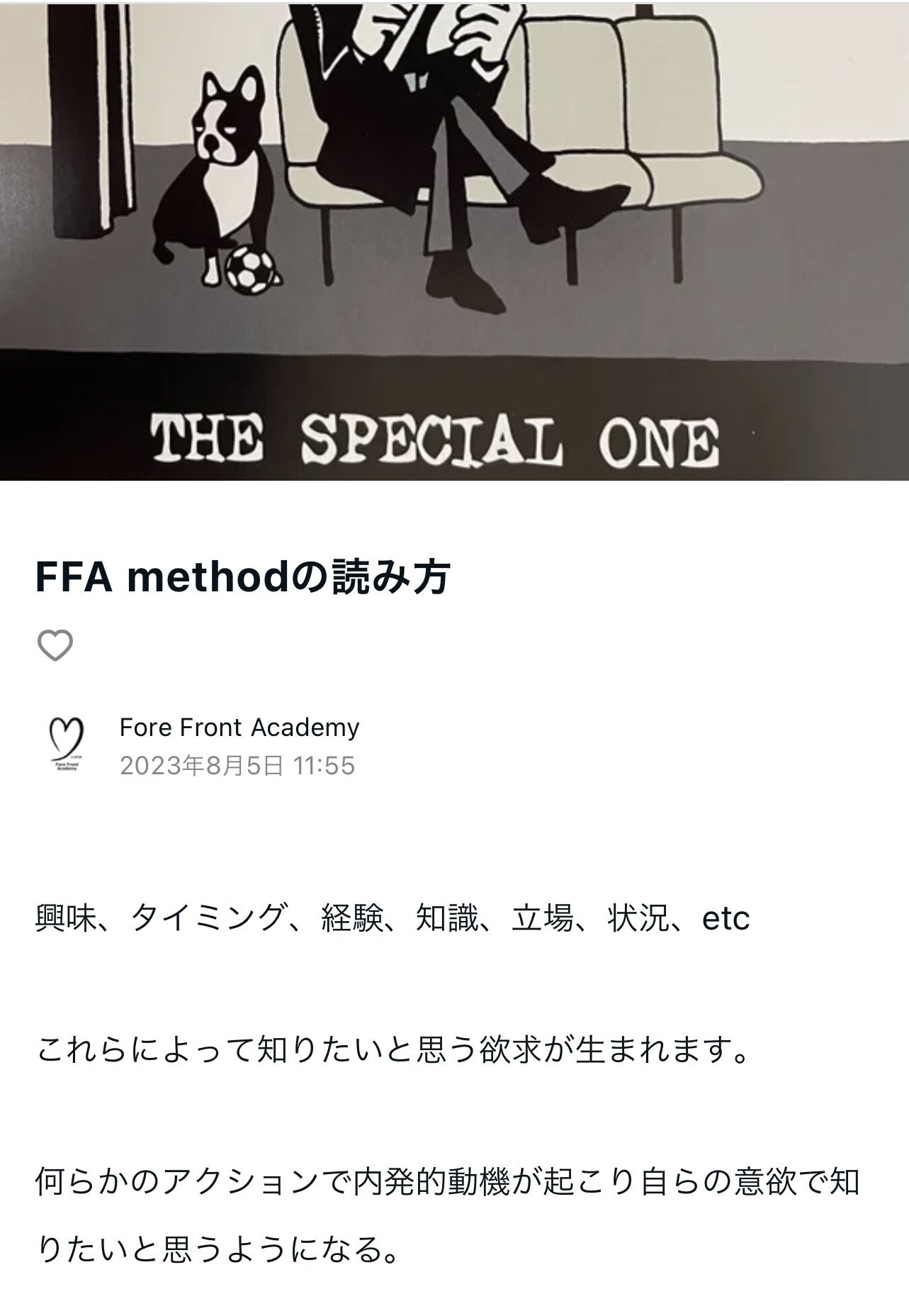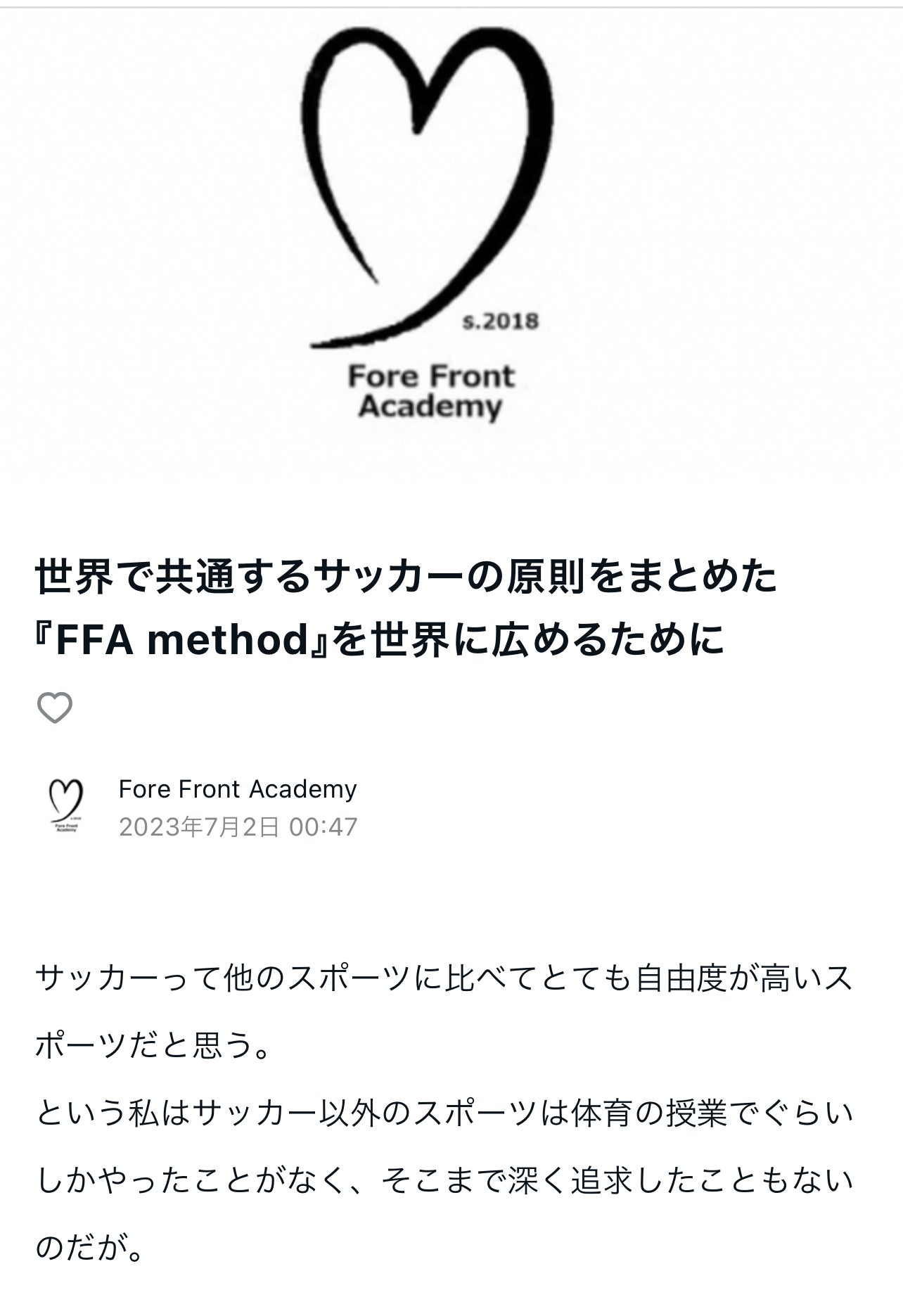 FFA note-5FFA noteを更新しました。https://note.com/ffa※URLはプロフィールに貼り付けています今回はFFA methodの読み方について日頃、どんな本を読んでますか?その本を読むのは何回目ですか?素敵な本と出会うのは一期一会だと思ってます。FFA methodはサッカーとの出会いを広げる本になりたいと思っています。読む度にどんどん深くなってくる、知りたくなってくる。あなたがまだ知らないポテンシャルを引き出し気付くことで今の自分が進化するきっかけを提供するのがFFA methodです。今回の出会いが皆様にとって素敵な時間になるように想いを込めて執筆しました。本を通じてどんな自分と出会いたいですか?https://camp-fire.jp/projects/view/682085※URLはプロフィールに貼り付けていますFFA methodを皆様の思いで広げて頂けますようクラウドファンディングのご支援、宜しくお願い致します。FFA methodに関するお問い合わせ、ご質問も宜しくお願いします。