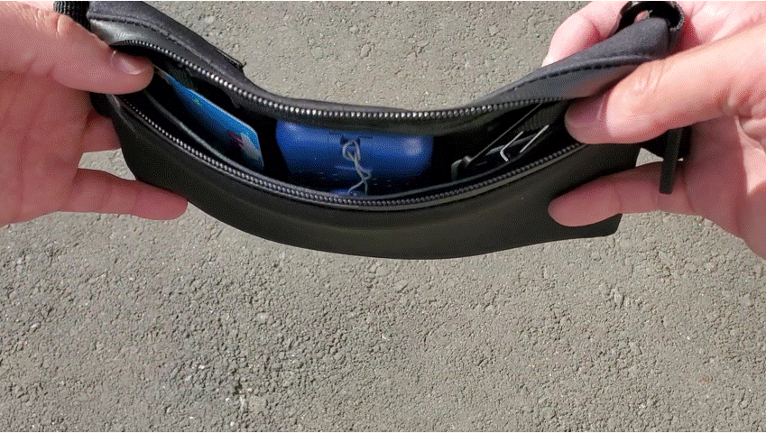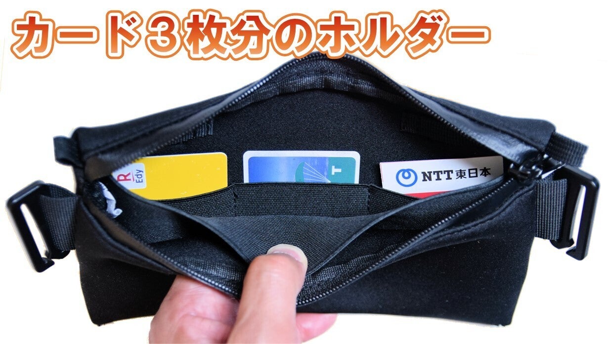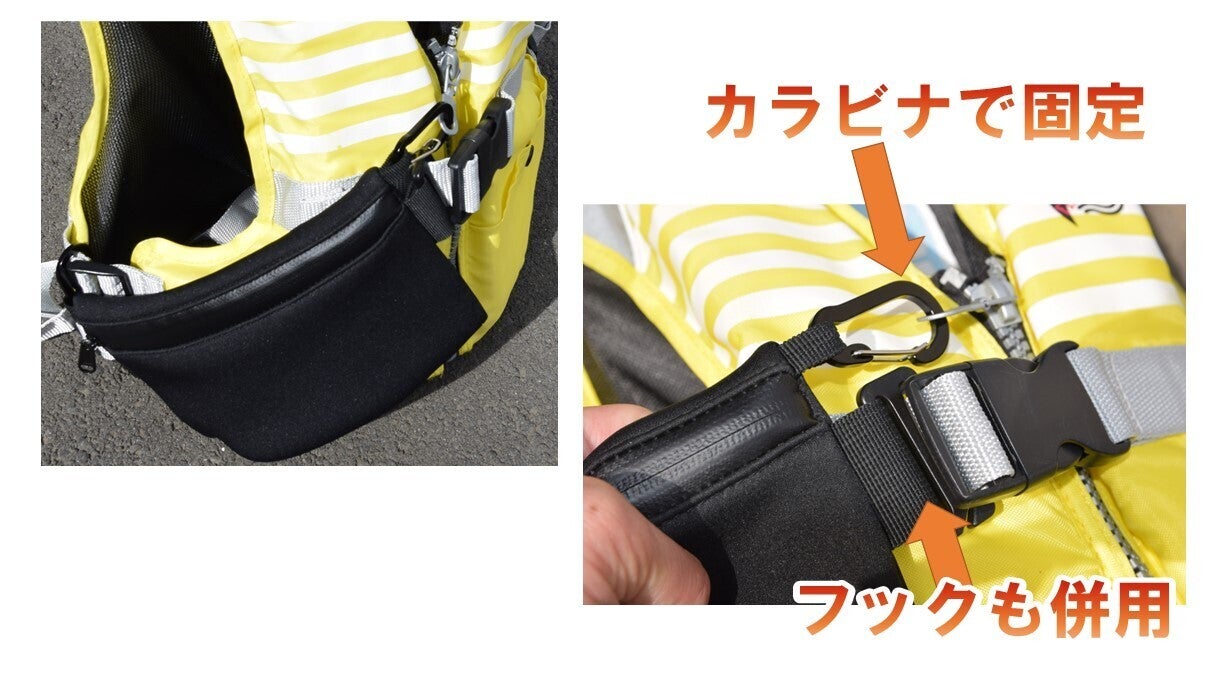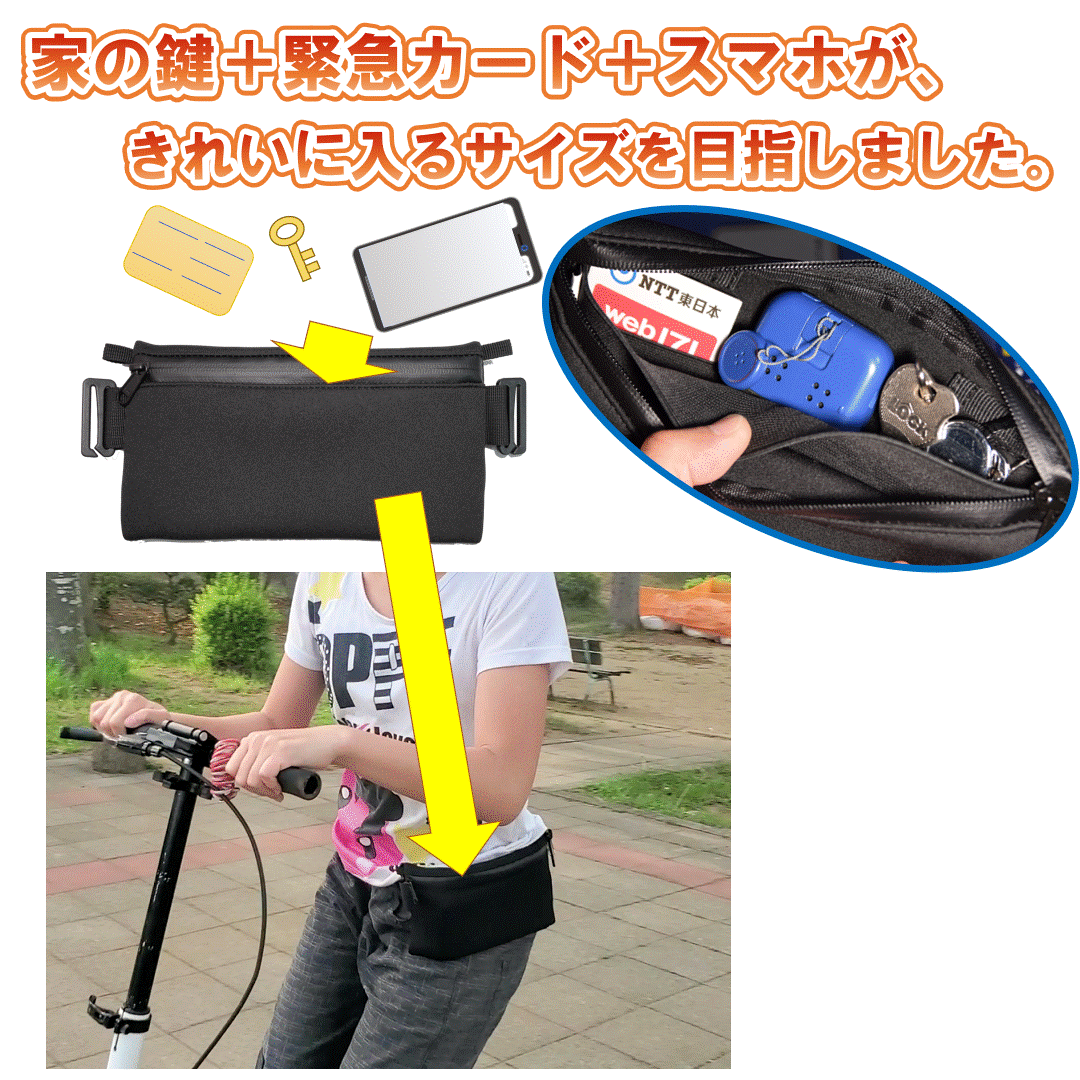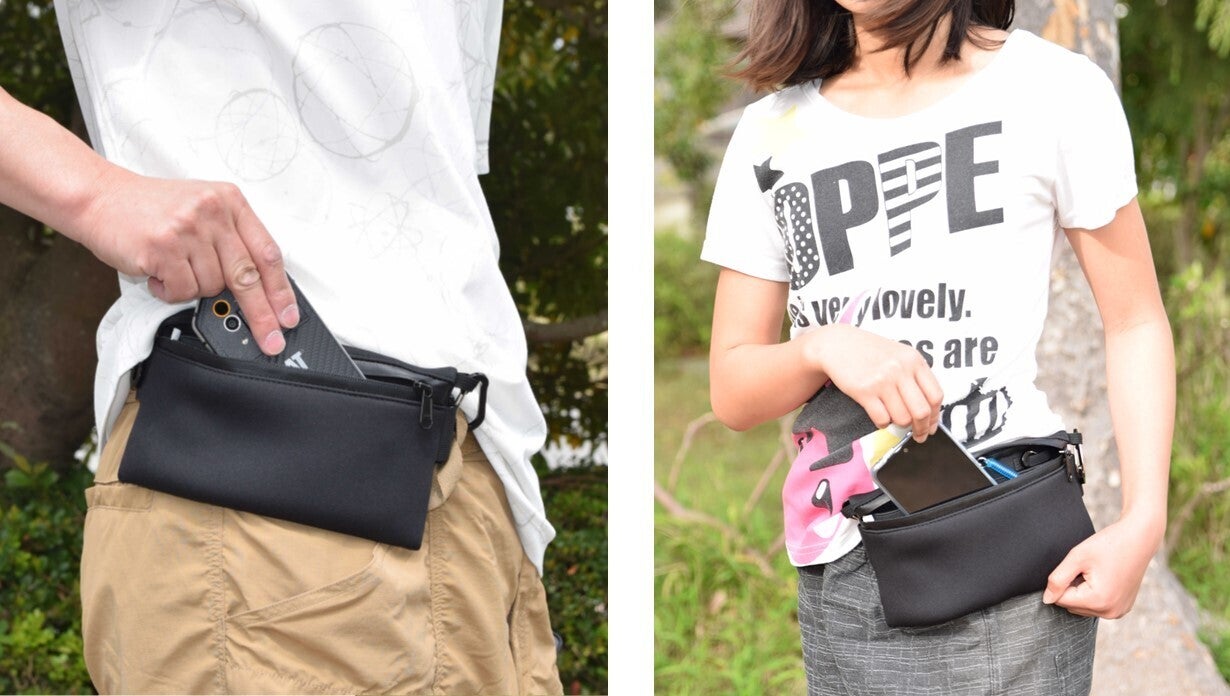 SUPなどの、動きや落水衝撃が予想されるアクティビティでは、首下げ等ではなく、より密着性の良い衣服のようなポーチが必要と考えました。