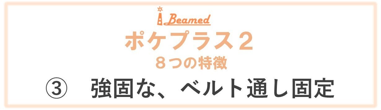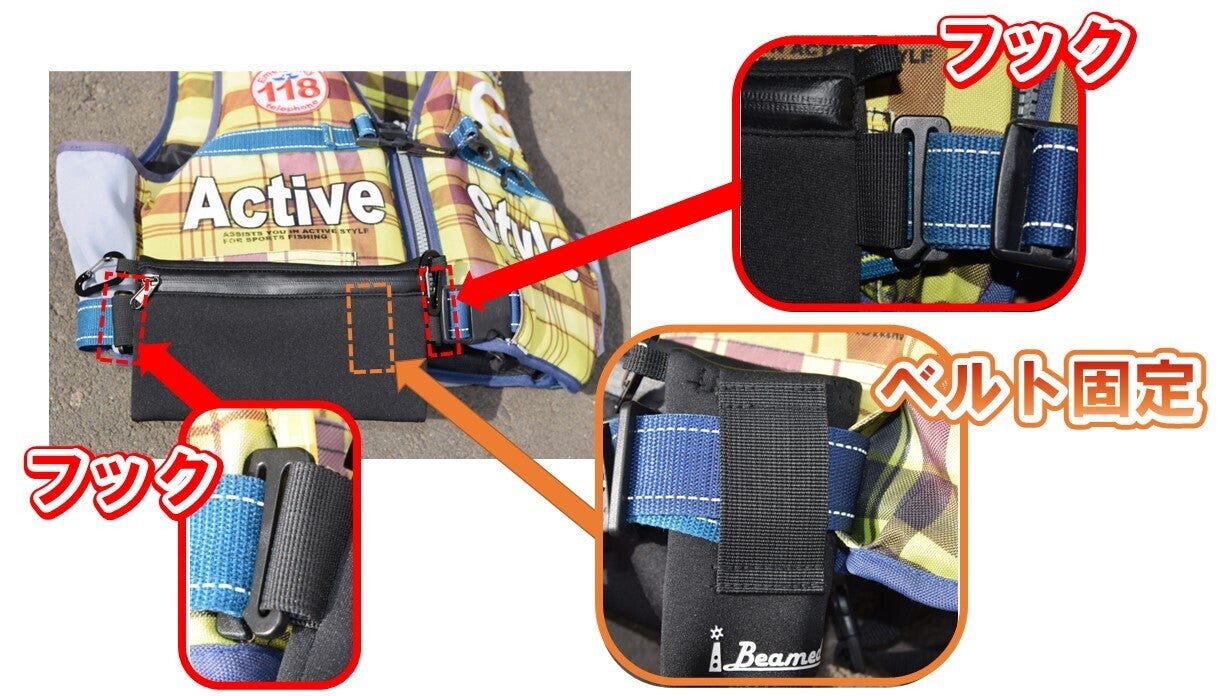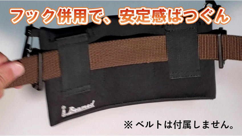引っ掛け樹脂金具とベルト通しは併用可能な配置です。併用すればズレを抑制して使い勝手が向上します。