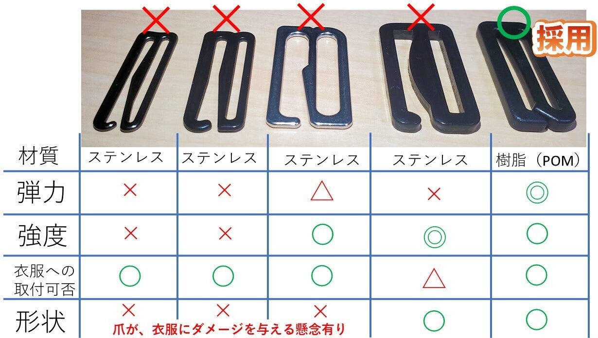 複数のフックを比較検討し、樹脂製(POM製)を採用しております。エンジニアリングプラスチックとも呼ばれる高強度素材です。