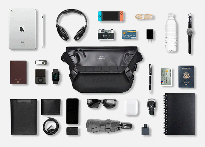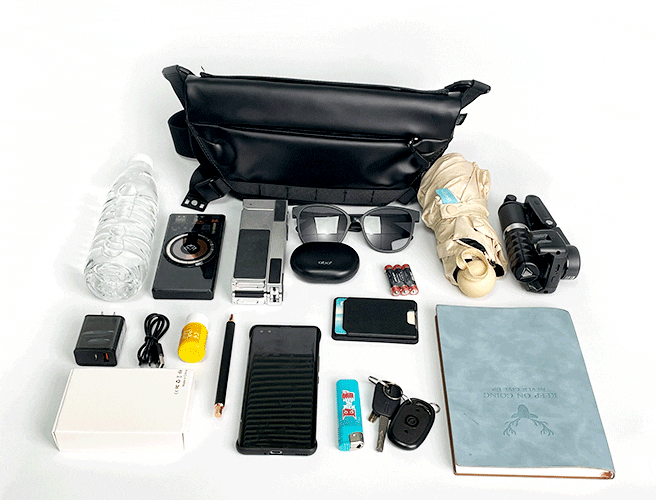 傘、手帳、パスポート、腕時計、充電器、イヤホン、タブレットなど、必要なものはすべて収納することができます。気軽にお出かけを楽しむことができます。