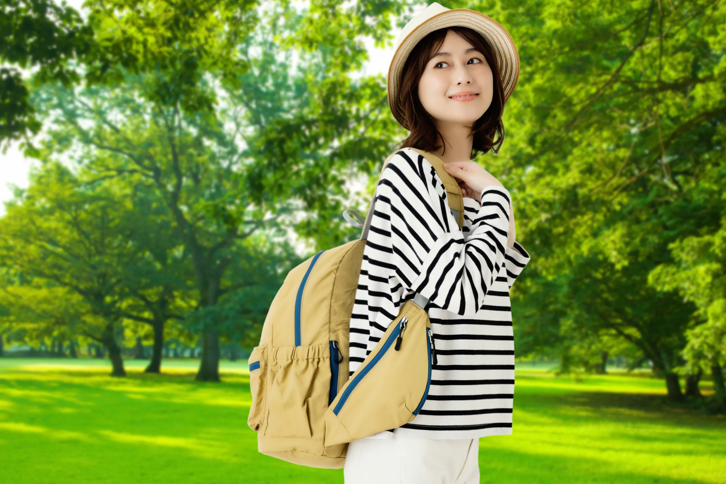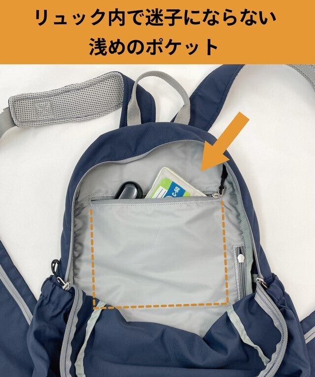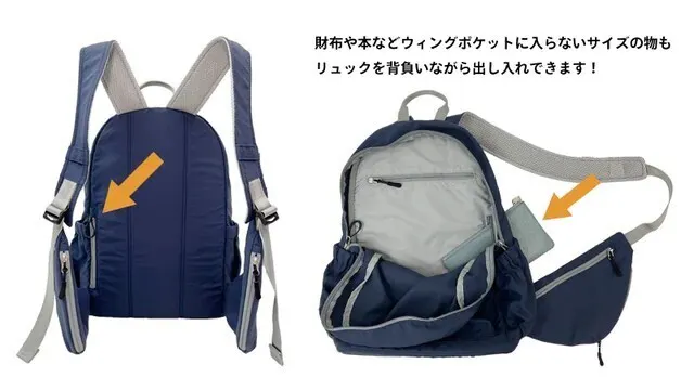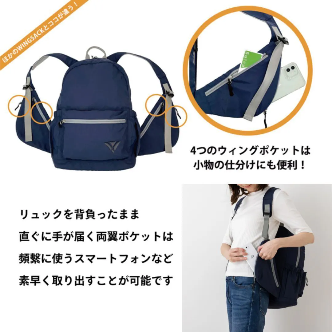 リュックサックの脇部分に付いた《ウイングポケット》でスマホやカード、チケットやパスポートなど、背負ったままでラクラク出し入れができる、とっても便利なリュックサックです。