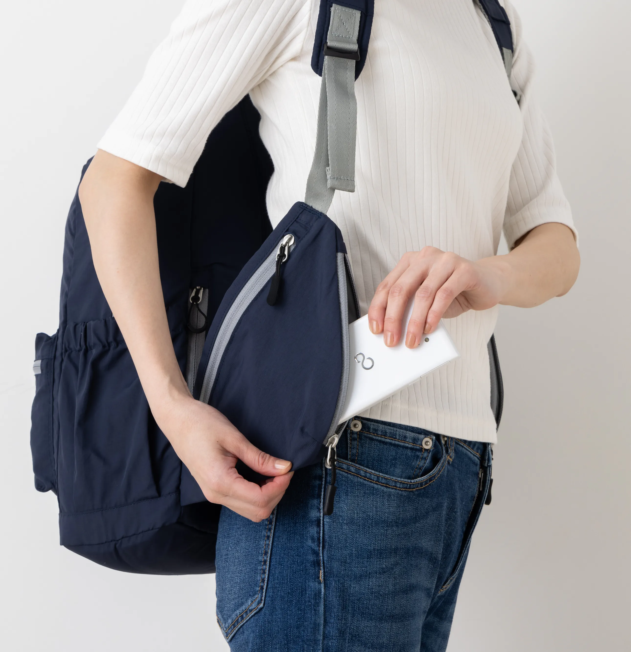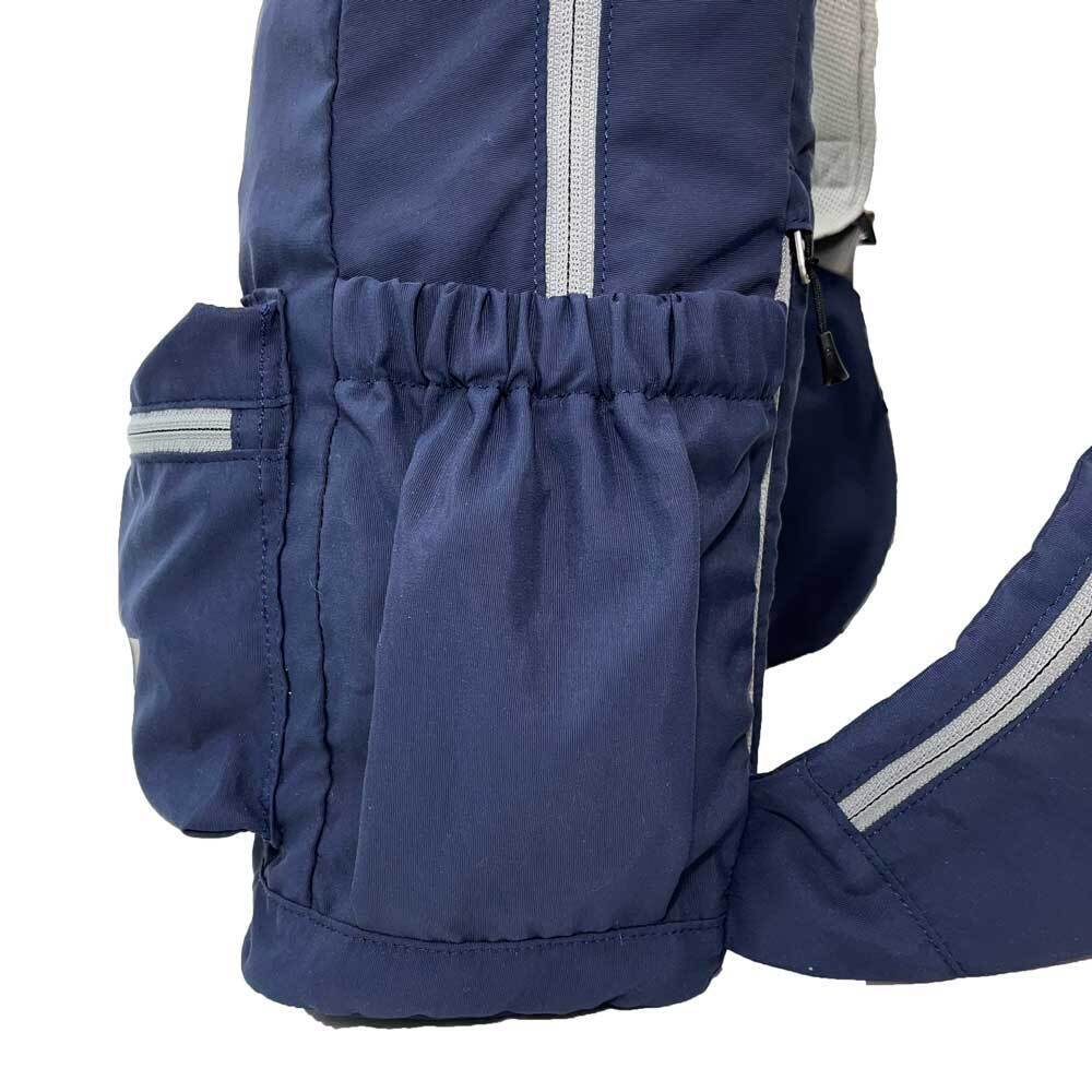 正面とサイド2ヶ所のファスナー付きウイングポケットで便利に使い分け