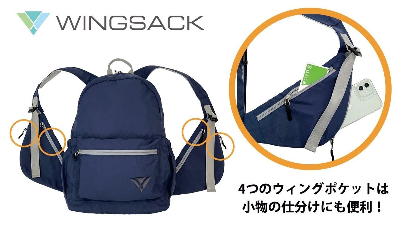 今回クラウドファンディングを実行しております WINGSACK は、背負ったまま手が届く両翼ウイングポケットにより、頻繁に使うスマホや交通カードなどの出し入れが簡単にアクセスでき、通勤通学や旅行に大変便利な商品です。特に海外では、防犯上の安全面にも有効な機能ポケットとなっています。