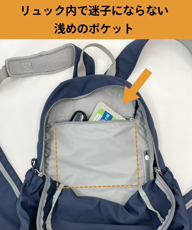 迷子になりがちな細かい物の整理に便利な浅めのファスナー付きポケット