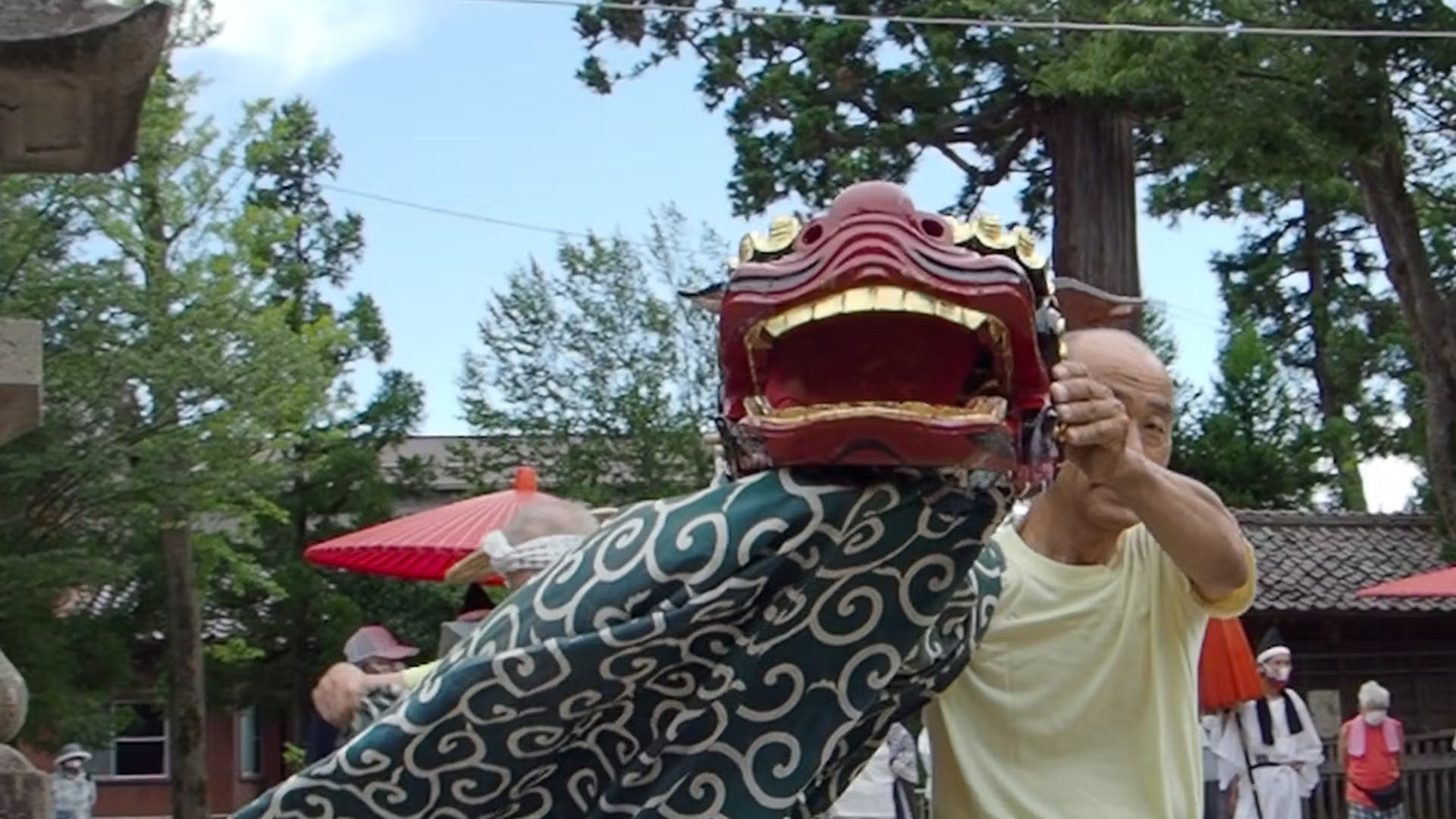 獅子の顔をした神楽で悪霊払いの舞を東西南北の四方で舞い、無病息災を祈念します。