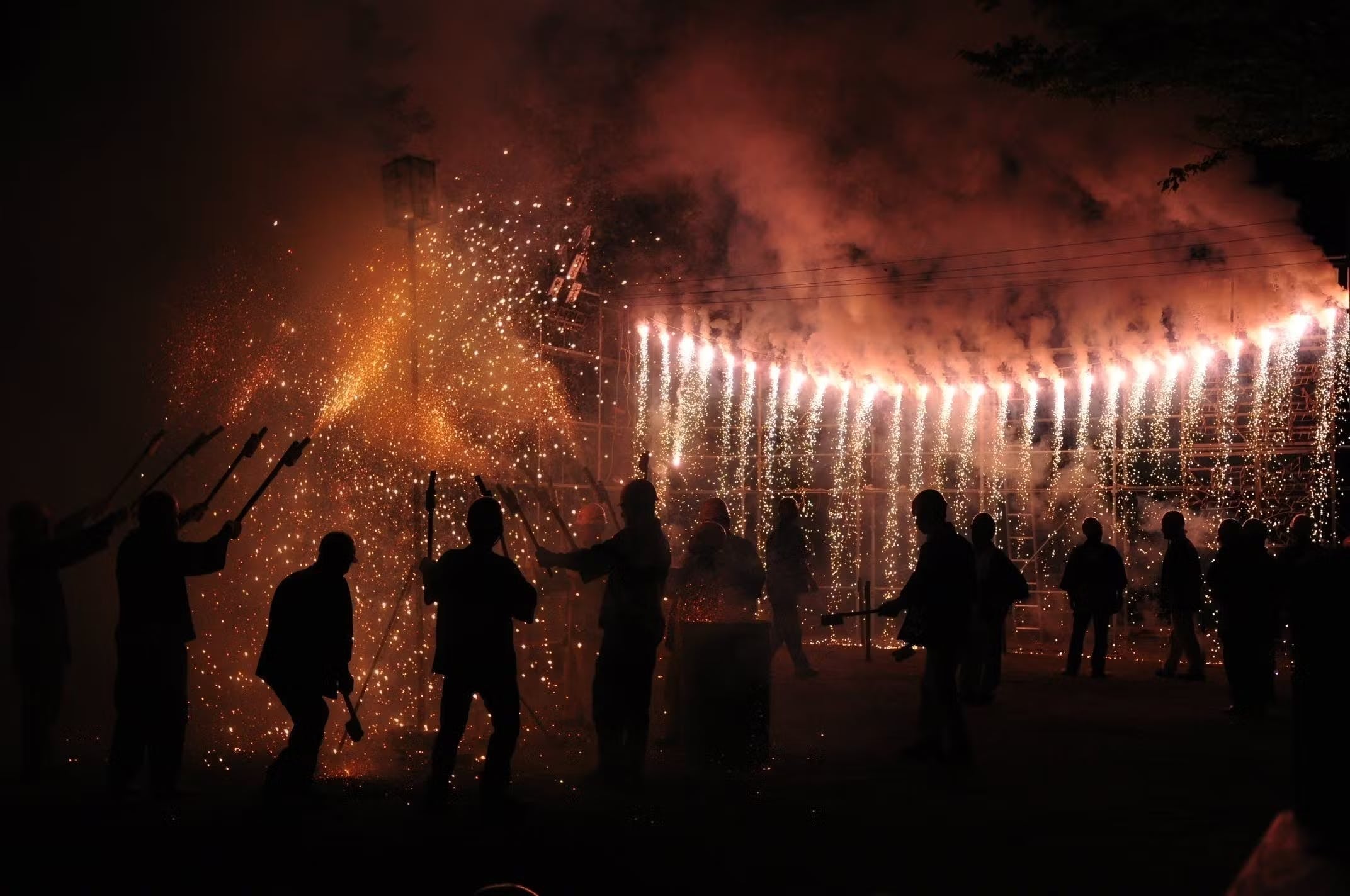 この祭りの最高潮で繰り広げられる地元花火方による草花火です。竹筒に火薬を詰め込んだ手持ちの草花火を、花火方が火の粉をかぶりながら次から次へと吹き上がらせます。