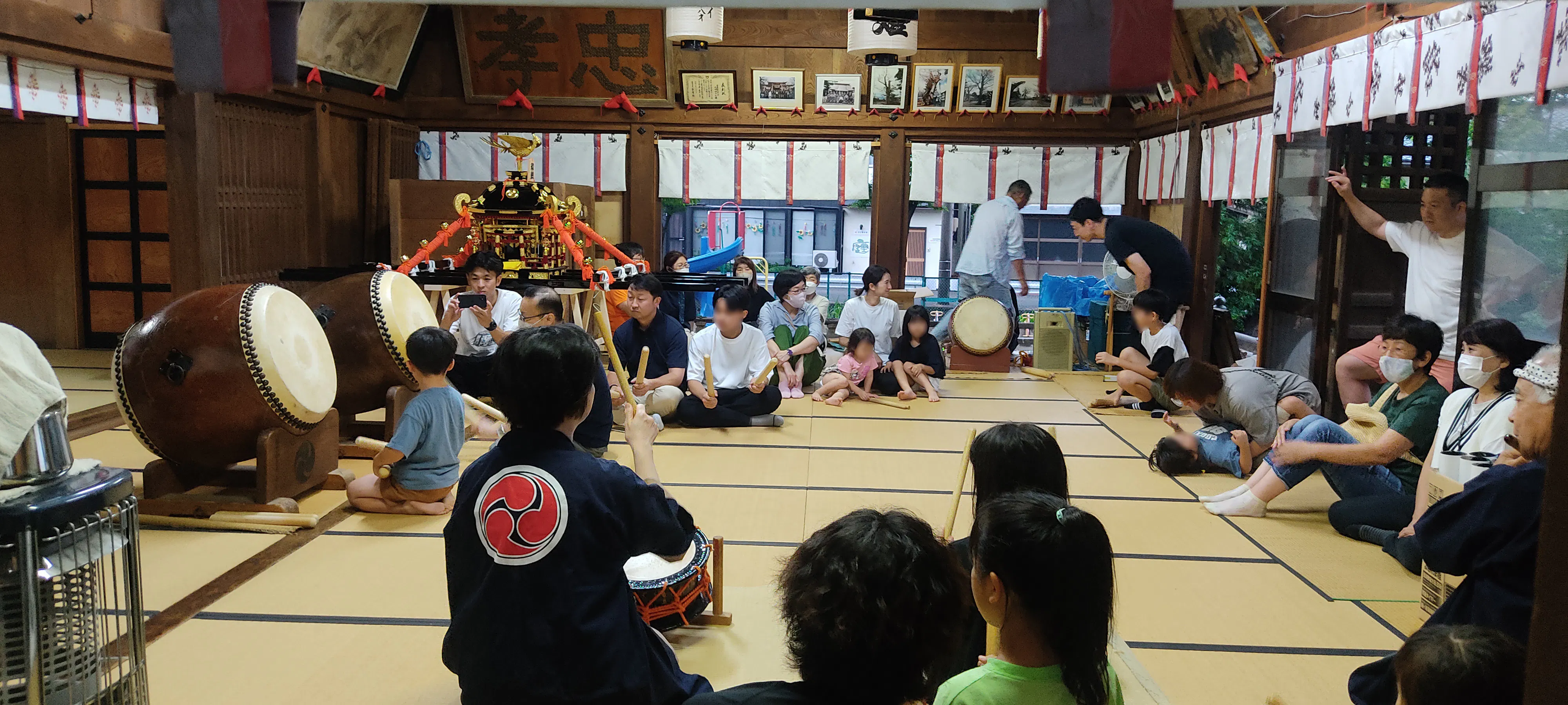 全国的にも珍しい花火囃子の笛の音にあわせて参加者全員で太鼓を叩く体験会でした。