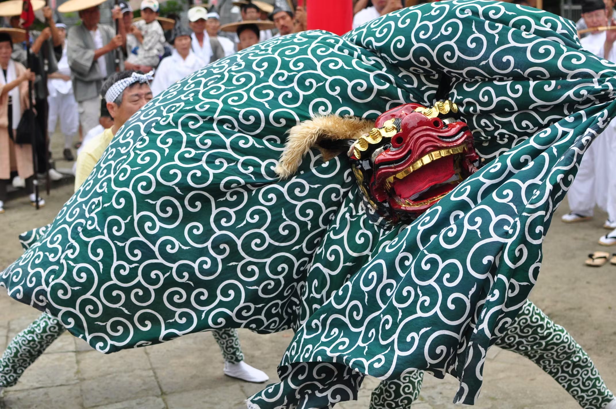 獅子の顔をした神楽で悪霊払いの舞を東西南北の四方で舞い、無病息災を祈念します。